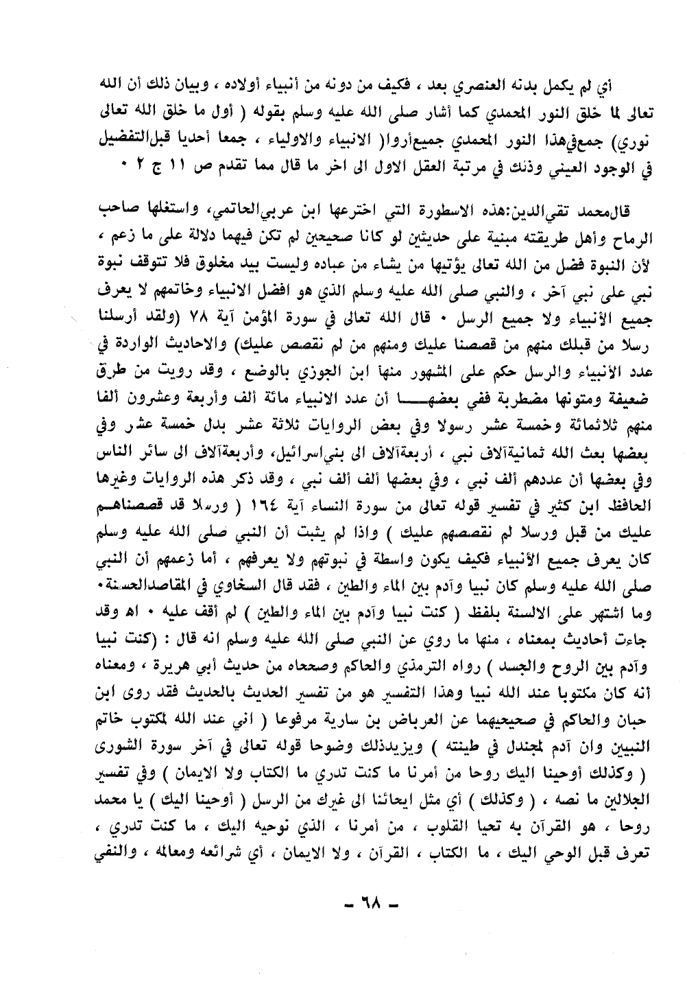 قال محمد تقي الدين الهلالي هذه الأسطورة التي اخترعها ابن العربي الحاتمي، واستغلها صاحب الرماح وأهل طريقته مبنية على حديثين لو كانا صحيحين لم تكن فيهما دلالة على ما زعم، لإن النبوة فضل من الله تعالى يؤتيها من يشاء من عباده وليست بيد مخلوق فلا تتوقف نبوة نبي على نبي آخر، والنبي صلى الله عليه وسلم هو أفضل الأنبياء وخاتمهم لا يعرف جميع الأنبياء ولا جميع الرسل، قال الله تعالى في سورة المؤمنون آية 78: {وَلَقَدْ أَرْسَلْنَا رُسُلًا مِنْ قَبْلِكَ مِنْهُمْ مَنْ قَصَصْنَا عَلَيْكَ وَمِنْهُمْ مَنْ لَمْ نَقْصُصْ عَلَيْكَ} والأحاديث الواردة في عدد الأنبياء والرسل حكم على المشهور منها ابن الجوزي بالوضع، وقد رويت من طرق ضعيفة ومتونها مضطربة ففي بعضها أن عدد الأنبياء مائة ألف وأربعة وعشرون ألفا منهم ثلاثمائة وخمسة عشرة رسولا وفي بعض الروايات ثلاثة بدل خمسة عشر وفي بعضها بعث الله ثمانية ألف نبي، أربعة آلف إلى بني إسرائيل، وأربعة آلف إلى سائر الناس وفي بعضها أن عددهم ألف نبي، وفي بعضها ألف ألف نبي، وقد ذكر هذه الروايات وغيرها الحافظ ابن كثير في تفسير قوله تعالى من سورة النساء آية 164: {وَرُسُلًا قَدْ قَصَصْنَاهُمْ عَلَيْكَ مِنْ قَبْلُ وَرُسُلًا لَمْ نَقْصُصْهُمْ عَلَيْكَ} وإذا لم بثبت أن النبي صلى الله عليه وسلم كان يعرف جميع الأنبياء فكيف يكون واسطة في نبوتهم ولا يعرفهم، أما زعمهم أن النبي صلى الله عليه وسلم كان نبيا وآدم بين الماء والطين، فقد قال السخاوي في المقاصد الحسنة، وما اشتهر على الألسنة بلفظ (كنت نبيا وآدم بين الماء والطين) لم أقف عليه اهـ وقد جاءت أحاديث بمعناه، منها ما روي عن النبي صلى الله عليه وسلم أنه قال: (كنت نبيا وآدم بين الروح والجسد) رواه الترمذي والحاكم وصححاه من حديث أبي هريرة، ومعناه أنه كان مكتوبا عند الله نبيا وهذا التفسير هو من تفسير الحديث بالحديث فقد روى