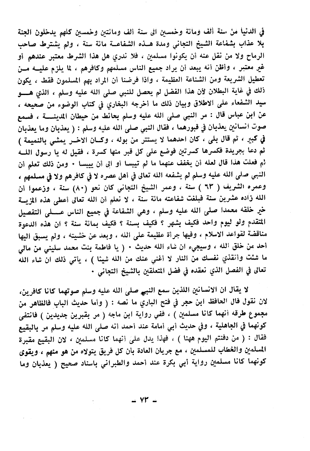 في الدنيا من سنة ألف ومائة وخمسين إلى سنة ألف ومائتين وخمسين كلهم يدخلون الجنة بلا عذاب بشفاعة الشيخ التجاني ومدة هذه الشفاعة مائة سنة، ولم يشترط صاحب الرماح ولا من نقل عنه أن يكونوا مسلمين، فلا ندري هل الشرط معتبر عندهم أو غير معتبر، وأظن أنه يبعد أن يراد جميع الناس مسلمهم وكافرهم، لما يلزم عليه من تعطيل الشريعة ومن الشناعة العظيمة، وإذا فرضنا أن المراد بهم المسلمون فقط، يكون ذلك في غاية البطلان لأن هذا الفضل لم يحصل للنبي صلى الله عليه وسلم، الذي هو سيد الشفعاء على الإطلاق وبيان ذلك ما أخرجه البخاري في كتاب الوضوء من صحيحه، عن ابن عباس قال: مر النبي صلى الله عليه وسلم بحائط من حيطان المدينة، فسمع صوت إنسانين يعذبان في قبورهما، فقال النبي صلى الله عليه وسلم: (يعدبان وما يعدبان في كبير، ثم قال بلى، كان أحدهما لا يستتر من بوله، وكان الآخر يمشي بالنميمة) ثم دعا بجريدة فكسرها كسرتين فوضع على كل قبر منها كسرة، فقيل له يا رسول الله لم فعلت هذا قال: (لعله أن يخفف عنهما ما لم ييبسا) ، ومن ذلك تعلم أن النبي صلى الله عليه وسلم لم يُشفِّعه الله تعالى في أهل عصره لا في كافرهم ولا في مسلمهم، وعمره الشريف (63) سنة، وعمر الشيخ التجاني كان نحو (80) سنة، وزعموا أن الله زاد عشرين سنة فبلغت مائة سنة، لا نعلم أن الله أعطى هذه المزية خير خلقه محمدا صلى الله عليه وسلم، وهي الشفاعة في جميع الناس على التفصيل المتقدم ولو ليوم واحد فكيف بشهر؟ فكيف بسنة؟ فكيف بمائة سنة؟ إن هذه الدعوة مناقضة لقواعد الإسلام، وفيها جرأة عظيمة على الله، وبعد عن خشيته، ولم يسبق إليها أحد من خلق الله، وسيجيء إن شاء الله حديث: (يا فاطمة بنت محمد سليني ما شئت وأنقذي نفسك من