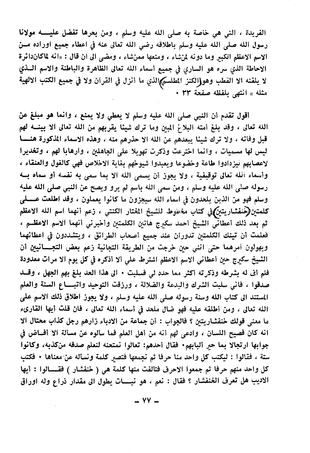 أقول تقدم أن النبي صلى الله عليه وسلم لا يعطي ولا يمنع؛ وإنما هو مبلِّغ عن الله تعالى؛ وقد بلغ أمته البلاغ المبين وما ترك شيئا يقربهم من الله تعالى إلا بينه لهم قبل وفاته؛ ولا ترك شيئا يبعدهم عن الله إلا حذرهم منه؛ وهذه الأسماء المذكورة هنا ليس لها مسميات؛ وإنما اخترعت وذكرت تهويلا على الجاهلي؛ وإرهابا لهم وتخديرا لأعصابهم ليزدادوا خضوعا وطاعة ويعبدوا شيخهم بغاية الإخلاص فهي كالغول والعنقاء؛ وأسماء الله تعالى توقيفية؛ ولا يجوز أن يسمى الله إلا بما سمى به نفسه أو سماه به رسوله صلى الله عليه وسلم؛ ومن سمى الله باسم لم يرو ويصح عن النبي صلى الله عليه وسلم فهو من الذين يلحدون في أسماء الله سيجزون ما كانوا يعملون؛ وقد اطلعت على كلمتين خنفشاريتين في كتاب مخطوط للشيخ المختار الكنتي؛ زعم أنها اسم الله الأعظم ثم بعد ذلك أعطاني الشيخ أحمد سكيرج هاتين الكلمتين وأخبرني أنهما اسم الله الأعظم؛ فعلمت أن تلك الكلمتين تدوران عند جميع أصحاب الطرائق؛ ويتشددون في إعطائهما ويهولون أمرهما حتى أنني حين خرجت من الطريقة التجانية زعم بعض التجانيين أن الشيخ سكيرج حين أعطاني الإسم الأعظم اشترط علي ألا أذكره في كل يوم إلا مرات معدودة فلم أف له بشرطه وذكرته أكثر مما حدد لي فسلبت. إلى هذا الحد بلغ بهم الجهل؛ وقد صدقوا؛ فإني سلبت الشرك والبدعة والضلالة؛ ورزقت التوحيد واتباع السنة والعلم المستند إلى كتاب الله وسنة رسول الله صلى الله عليه وسلم؛ ولا يجوز إطلاق ذلك الإسم على الله تعالى؛ ومن أطلقه عليه فهو ضال ملحد في أسماء الله تعالى؛ فإن قلت أيها القارئ ما معنى قولك خنفشاريتين؟ فالجواب: أن جماعة من الأدباء زارهم رجل كذاب محتال إلا أنه كان فصيح اللسان؛ وادعى لهم أنه من أهل العلم فما سألوه عن مسألة إلا أفاض في جوابها ارتجالا بما حير ألبابهم. فقال أحدهم: تعالوا نمتحنه لنعلم صدقه من كذبه؛ وكانوا ستة؛