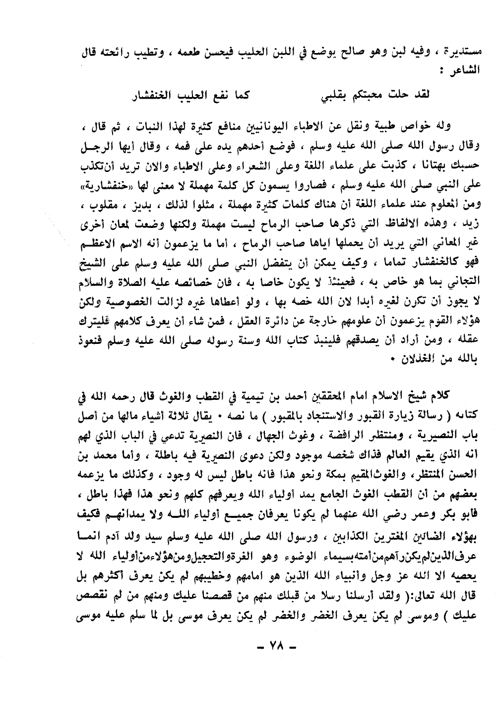 كلام شيخ الإسلام إمام المحققين أحمد بن تيمية في القطب والغوث قال رحمه الله في كتابه: (رسالة زيارة القبور والاستنجاد بالمقبور) ما نصه: يقال ثلاثة أشياء ما لها من أصل باب النصيرية ومنتظر الرافضة وغوث الجهال فإن النصيرية تدعي في الباب الذي لهم أنه الذي يقيم العالم فذاك شخصه موجود ولكن دعوى النصيرية فيه باطلة وأما محمد بن الحسن المنتظر والغوث المقيم بمكة ونحو هذا فإنه باطل ليس له وجود وكذلك ما يزعمه بعضهم من أن القطب الغوث الجامع يمد أولياء الله ويعرفهم كلهم ونحو هذا فهذا باطل فأبو بكر وعمر رضي الله عنهما لم يكونا يعرفان جميع أولياء الله ولا يمدانهم فكيف بهؤلاء الضالين المغترين الكذابين ورسول الله صلى الله عليه وآله وسلم سيد ولد آدم إنما عرف الذين لم يكن رآهم من أمته بسيماء الوضوء وهو الغرة والتحجيل ومن هؤلاء من أولياء الله من لا يحصيه إلا الله عز وجل وأنبياء الله الذين هو إمامهم وخطيبهم لم يكن يعرف أكثرهم بل قال الله تعالى: {xكصَلَّى اللهُ عَلَيْهِ وَسَلَّمَâ'ur قَدْ قَصَصْنَاهُمْ عَلَيْكَ مِنْ قَبْلُ وَرُسُلًا لَمْ نَقْصُصْهُمْ عَلَيْكَ} وموسى لم يكن يعرف الخضر والخضر لم يكن يعرف موسى بل لما سلم عليه موسى