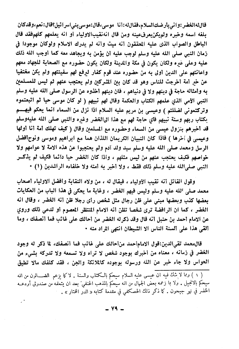 وقول القائل إنه نقيب الأولياء فيقال له من ولاه النقابة وأفضل الأولياء أصحاب محمد صلى الله عليه وآله وسلم وليس فيهم الخضر وعامة ما يحكى في هذا الباب من الحكايات بعضها كذب وبعضها مبني على ظن رجل مثل شخص رأى رجلا ظن أنه الخضر وقال إنه الخضر كما أن الرافضة ترى شخصا تظن أنه الإمام المنتظر المعصوم أو تدعي ذلك وروي عن الإمام أحمد بن حنبل أنه قال: وقد ذكر له الخضر من أحالك على غائب فما أنصفك وما ألقى هذا على ألسنة الناس إلا الشيطان انتهى المراد منه.