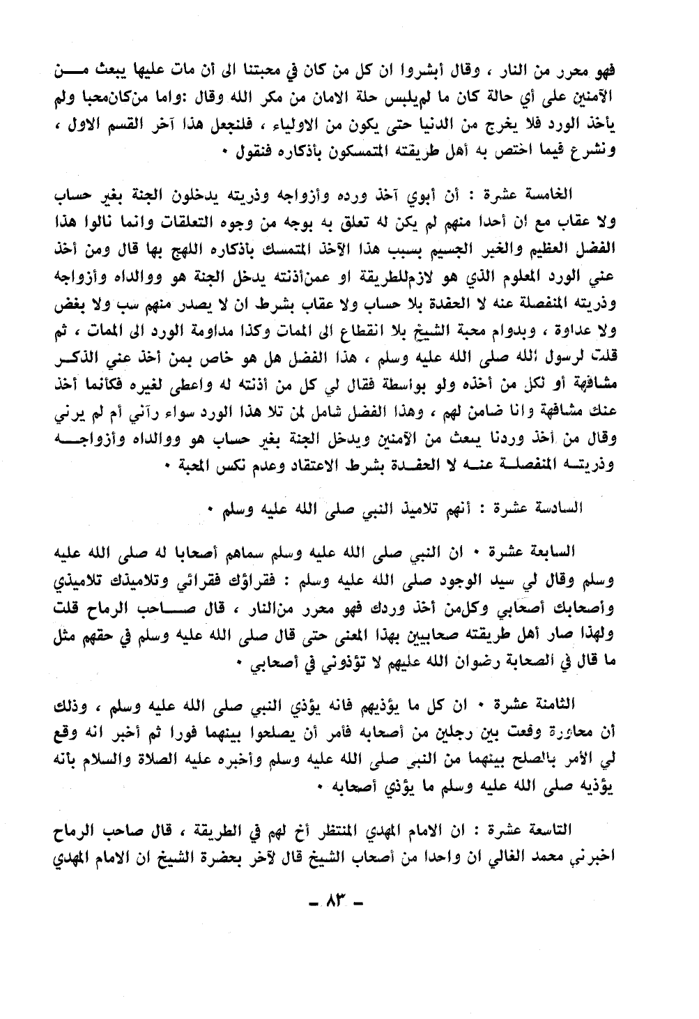 فهو محرر من النار؛ وقال ابشروا إن كل من كان في محبتنا إلى أن مات عليها يبعث من الآمنين على أي حالة كان ما لم يلبس حلة الأمان من مكر الله وقال: وأما من كان محبا ولم يأخذ الورد فلا يخرج من الدنيا حتى يكون من الأولياء؛ فلنجعل هذا أخر القسم الأول ونشرع فيما أختص به أهل طريقته المتمسكون بأذكاره فنقول: