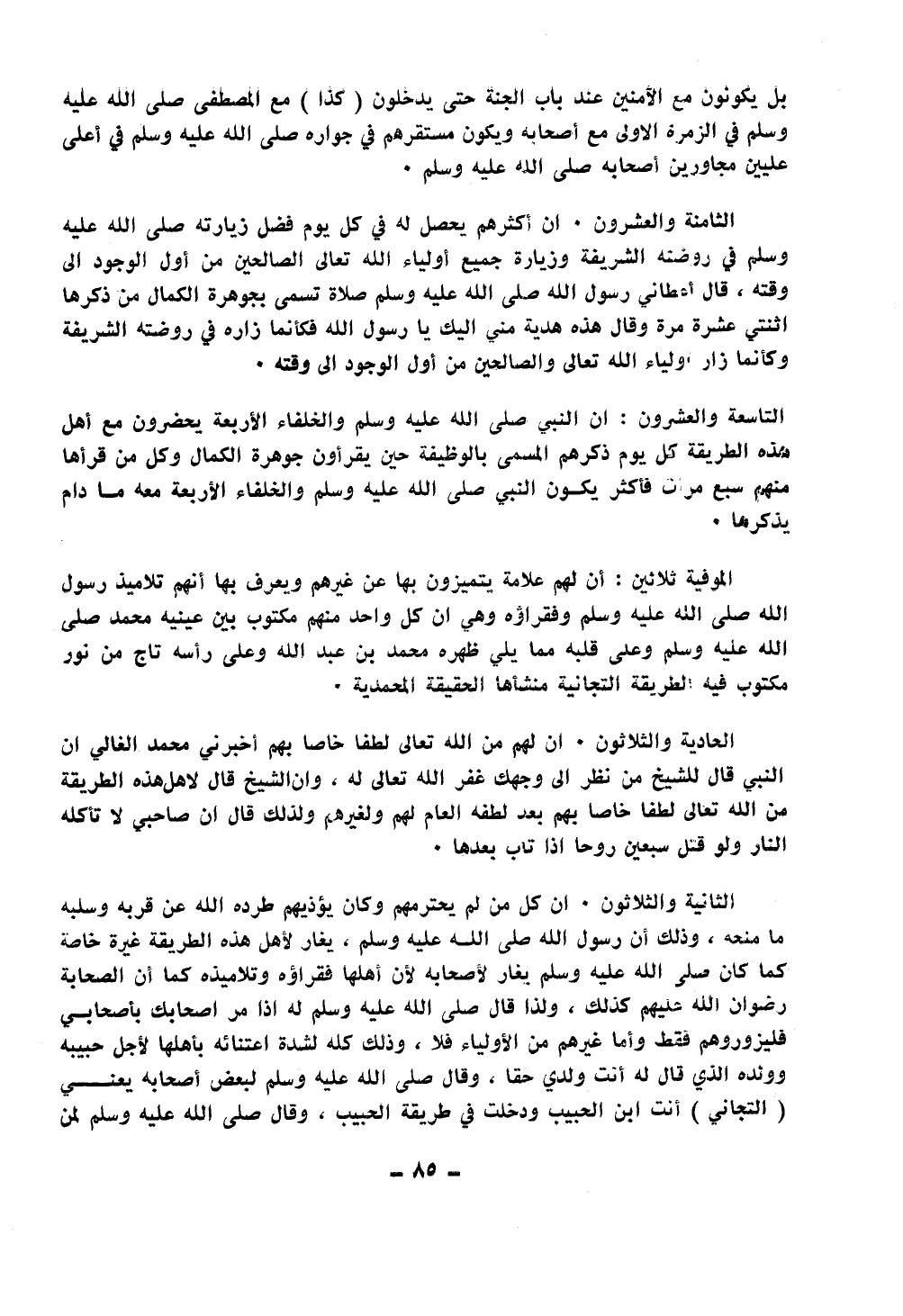 التاسعة والعشرون: أن النبي صلى الله عليه وسلم والخلفاء الأربعة يحضرون مع أهل هذه الطريقة كل يوم ذكرهم المسمى بالوظيفة حين يقرؤون جوهرة الكمال وكل من قرأها منهم سبع مرات فأكثر يكون النبي صلى الله عليه وسلم والخلفاء الأربعة معه ما دام يذكرها.