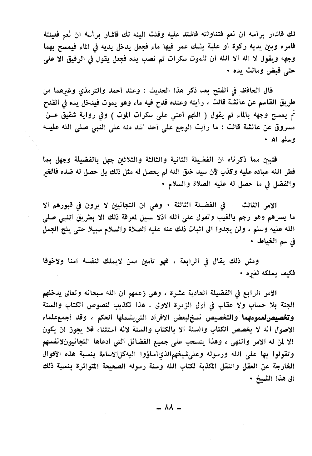 فتبين مما ذكراه أن الفضيلة الثانية والثالثة والثلاثين جهل بالفضيلة وجهل بما فطر الله عليه عباده وكذب عليه لآن سيد خلق الله لم يحصل له ذلك بل حصل له ضده فالخير والفضل في ما حصل له عليه الصلاة والسلام.