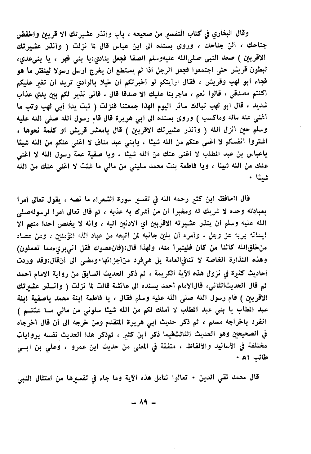 وقال البخاري في كتاب التفسير من صحيحه؛ باب وأنذر عشيرتك الأقربين واخفض جناحك؛ ألن جناحك؛ وروى بسنده إلى بن عباس لما نزلت: {وَأَنْذِرْ عَشِيرَتَكَ الْأَقْرَبِينَ (214) } صعد النبي صلى الله عليه وسلم الصفا وجعل ينادي يا بني فهر يا بني عدي؛ لبطون قريش حتى اجتمعوا فجعل الرجل إذا لم يستطع أن يخرج أرسل رسولا لينظر ما هو فجاء أبو لهب وقريش؛ فقال أرأيتكم لو أخبرتكم أن خيلا بالوادي تريد أن تغير عليكم أكنتم مصدقيَّ قالوا نعم؛ ما جربنا عليك إلا صدقا قال إني نذير لكم بين عذب شديد؛ قال أبو لهب: تبا لك سائر اليوم ألهذا جمعتنا فنزلت: {تَبَّتْ يَدَا أَبِي لَهَبٍ وَتَبَّ (1) مَا أَغْنَى عَنْهُ مَالُهُ وَمَا كَسَبَ (2) } وروى بسنده إلى أبي هريرة قال قام رسول الله صلى الله عليه وسلم حين أنزل الله: {وَأَنْذِرْ عَشِيرَتَكَ الْأَقْرَبِينَ (214) } قال يا معشر قريش أو كلمة مثلها؛ اشتروا أنفسكم لا أغني عنكم من الله شيئا؛ يا بني عبد مناف لا أغني عنكم من الله شيئا؛ يا عباس بن عبد المطلب لا أغني عنك من الله شيئا؛ ويا صفية عمة رسول الله لا أغني عنك من الله شيئا؛ ويا فاطمة بنت محمد ساليتي من مالي ما شئت لا أغني عنك من الله شيئا.