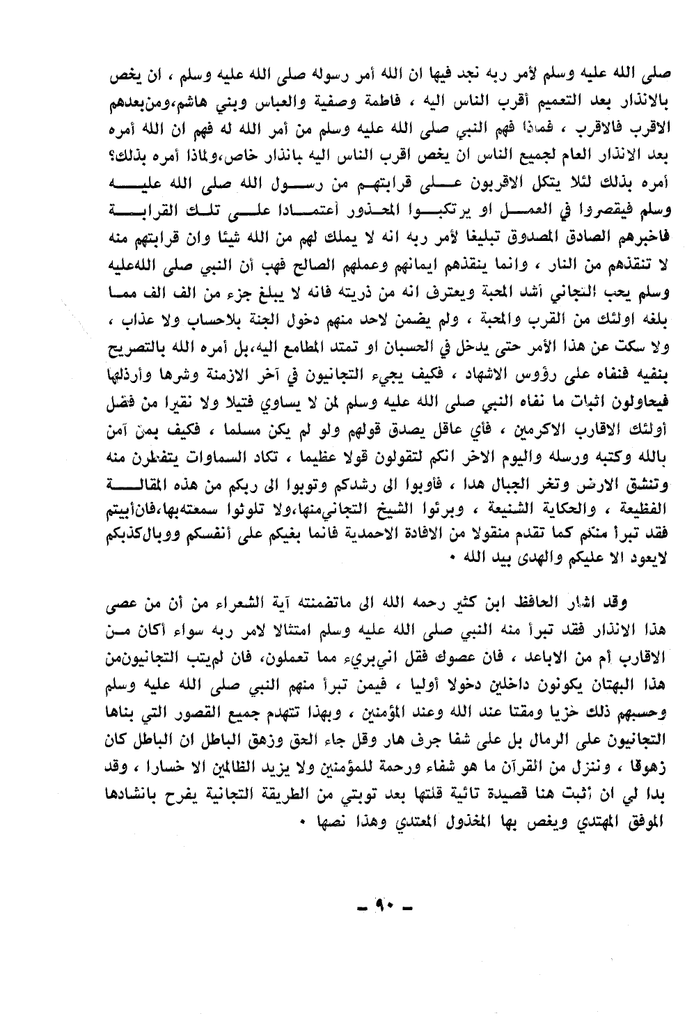 وقد أشار الحافظ رحمه الله على ما تضمنه آية الشعراء من أن من عصى هذا الإنذار فقد تبرأ منه النبي صلى الله عليه وسلم امتثالا لأمر ربه سواء أكان من الأقارب أم الأباعد؛ فإن عصوك فقل إني برء مما تعملون؛ فإن لم يتب التجانيون من هذا البهتان يكونون داخلين دخولا أوليا فيمن تبرأ منهم النبي صلى الله عليه وسلم وحسبهم ذلك خزيا ومقتا عند الله وعند المؤمنين؛ وبهذا تتهدم جميع القصور التي بناها التجانيون على الرمال بل على شفا جرف هار {وَقُلْ جَاءَ الْحَقُّ وَزَهَقَ الْبَاطِلُ إِنَّ الْبَاطِلَ كَانَ زَهُوقًا (81) وَنُنَزِّلُ مِنَ الْقُرْآَنِ مَا هُوَ شِفَاءٌ وَرَحْمَةٌ لِلْمُؤْمِنِينَ وَلَا يَزِيدُ الظَّالِمِينَ إِلَّا خَسَارًا} (82) ؛ وقد بدا لي أن أثبت هنا قصيدة تائية قلتها بعد توبتي من الطريقة التجانية يفرح بإنشادها الموفق المهتدي ويغص بها المخذول المعتدي وهذا نصها: