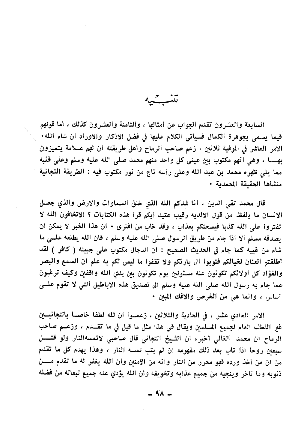 الأمر العاشر: في الموفية ثلاثين؛ زعم صاحب الرماح وأهل طريقته أن لهم علامة يتميزون بها. وهي أنهم مكتوب بين عيني كل واحد منهم محمد صلى الله عليه وسلم وعلى قلبه مما يلي ظهره محمد بن عبد الله وعلى رأسه تاج من نور مكتوب فيه: الطريقة التجانية منشأها الحقيقة المحمدية.