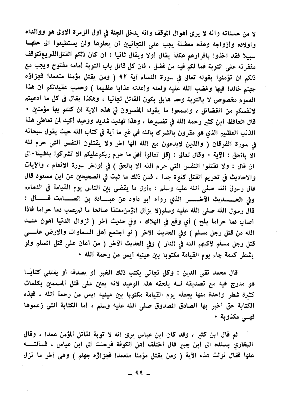 لا من حسناته وأنه لا يرى أهوال الموقف وأنه يدخل الجنة في أو ل الزمرة الأولى هو ووالداه وأولاده وأزواجه وهذه معضلة يجب على التجانيين أن يحلُّوها ولن يستطيعوا إلى حلها سبيلا فقد أُخذوا بإقرارهم هكذا يقال أولا ويقال ثانيا: إن كان القتل الذريع تتوقف مغفرته على التوبة فما لكم فيه من فضل؛ فإنَّ كل قاتل باب التوبة أمامه مفتوح ويجب مع ذلكم أن تؤمنوا بقوله تعالى في سورة النساء آية 92: {وَمَنْ يَقْتُلْ مُؤْمِنًا مُتَعَمِّدًا فَجَزَاؤُهُ جَهَنَّمُ خَالِدًا فِيهَا وَغَضِبَ اللَّهُ عَلَيْهِ وَلَعَنَهُ وَأَعَدَّ لَهُ عَذَابًا عَظِيمًا (93) } وحسب عقيدتكم أن هذا العموم مخصوص لا بالتوبة وحدها بل يكون القاتل تجانيا؛ وهكذا يقال في كل ما ادعيتم لأنفسكم من الفضائل؛ واسمعوا ما يقوله المفسرون في هذه الآية إن كنتم بها مؤمنين قال الحافظ ابن كثير رحمه الله في تفسيرها؛ وهذا تهديد شديد ووعيد أكيد لمن تعاطى هذا الذنب العظيم الذي هو مقرون بالشرك بالله في غير ما آية في كتاب الله حيث يقول سبحانه في سورة الفرقان: {وَالَّذِينَ لَا يَدْعُونَ مَعَ اللَّهِ إِلَهًا آَخَرَ وَلَا يَقْتُلُونَ النَّفْسَ الَّتِي حَرَّمَ اللَّهُ إِلَّا بِالْحَقِّ} الآية. وقال تعالى: {قُلْ تَعَالَوْا أَتْلُ مَا حَرَّمَ رَبُّكُمْ عَلَيْكُمْ أَلَّا تُشْرِكُوا بِهِ شَيْئًا}