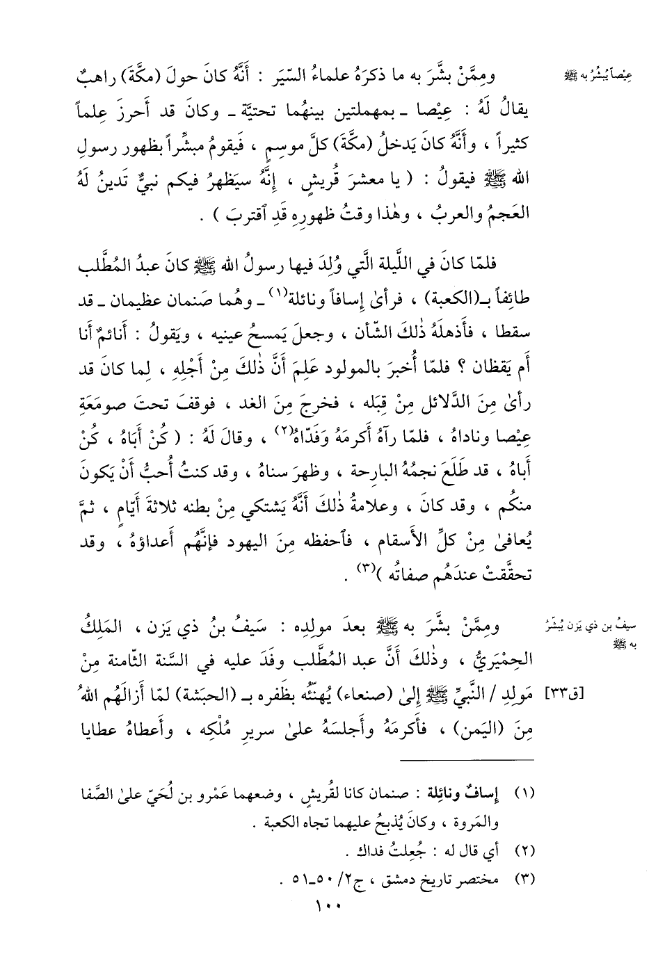 وممّن بشّر به صلى الله عليه وسلم بعد مولده: سيف بن ذي يزن، الملك الحميريّ، وذلك أنّ عبد المطّلب وفد عليه في السّنة الثّامنة من مولد/ النّبيّ صلى الله عليه وسلم إلى (صنعاء) يهنّئه بظفره ب (الحبشة) لمّا أزالهم الله من (اليمن) ، فأكرمه وأجلسه على سرير ملكه، وأعطاه عطايا