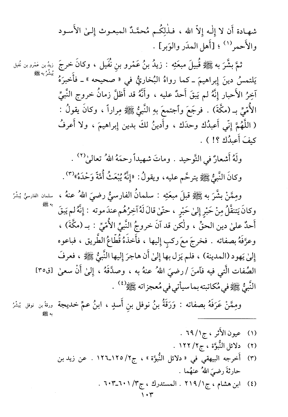 ثمّ بشّر به صلى الله عليه وسلم قبيل مبعثه: زيد بن عمرو بن نفيل، وكان خرج يلتمس دين إبراهيم- كما رواه البخاريّ في «صحيحه» - فأخبره آخر الأحبار إنّه لم يبق أحد عليه، وأنّه قد أظلّ زمان خروج النّبيّ الأمّيّ ب (مكّة) . فرجع واجتمع به النّبيّ صلى الله عليه وسلم مرارا، وكان يقول: