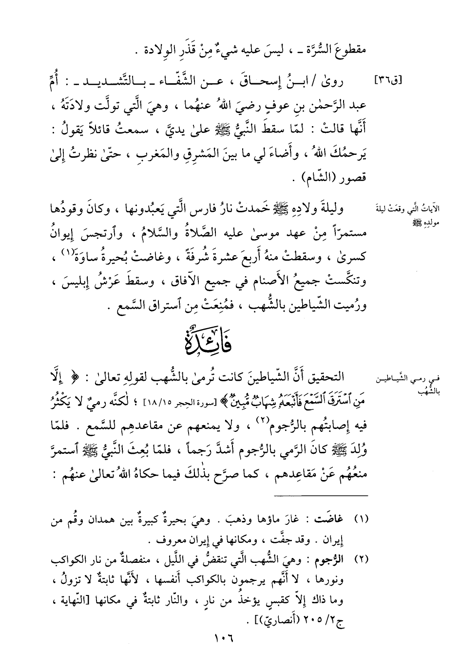 (2) الرّجوم: وهي الشّهب الّتي تنقضّ في اللّيل، منفصلة من نار الكواكب ونورها، لا أنّهم يرجمون بالكواكب أنفسها، لأنّها ثابتة لا تزول، وما ذاك إلّا كقبس يؤخذ من نار، والنّار ثابتة في مكانها [النّهاية، ج 2/ 205 (أنصاريّ) ] .