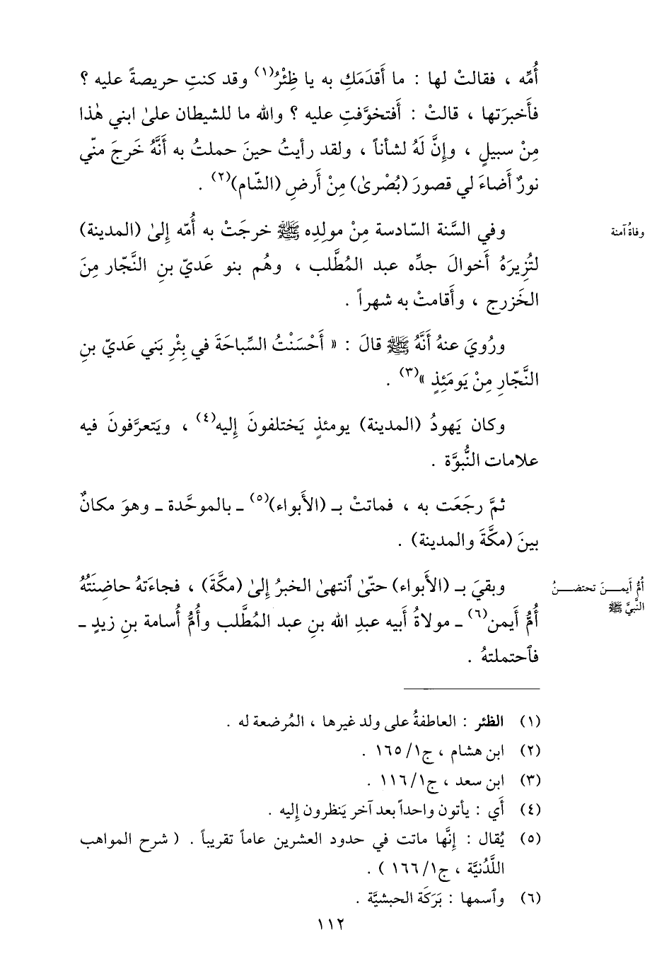 وبقي ب (الأبواء) حتّى انتهى الخبر إلى (مكّة) ، فجاءته حاضنته أمّ أيمن «6» - مولاة أبيه عبد الله بن عبد المطّلب وأمّ أسامة بن زيد- فاحتملته.