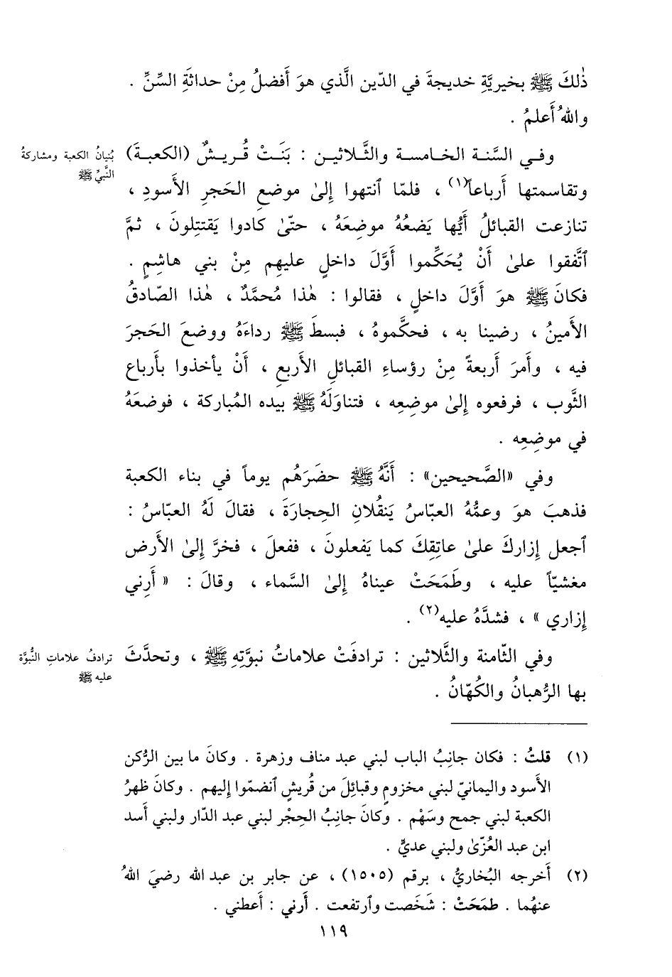 وفي «الصّحيحين» : أنّه صلى الله عليه وسلم حضرهم يوما في بناء الكعبة فذهب هو وعمّه العبّاس ينقلان الحجارة، فقال له العبّاس: