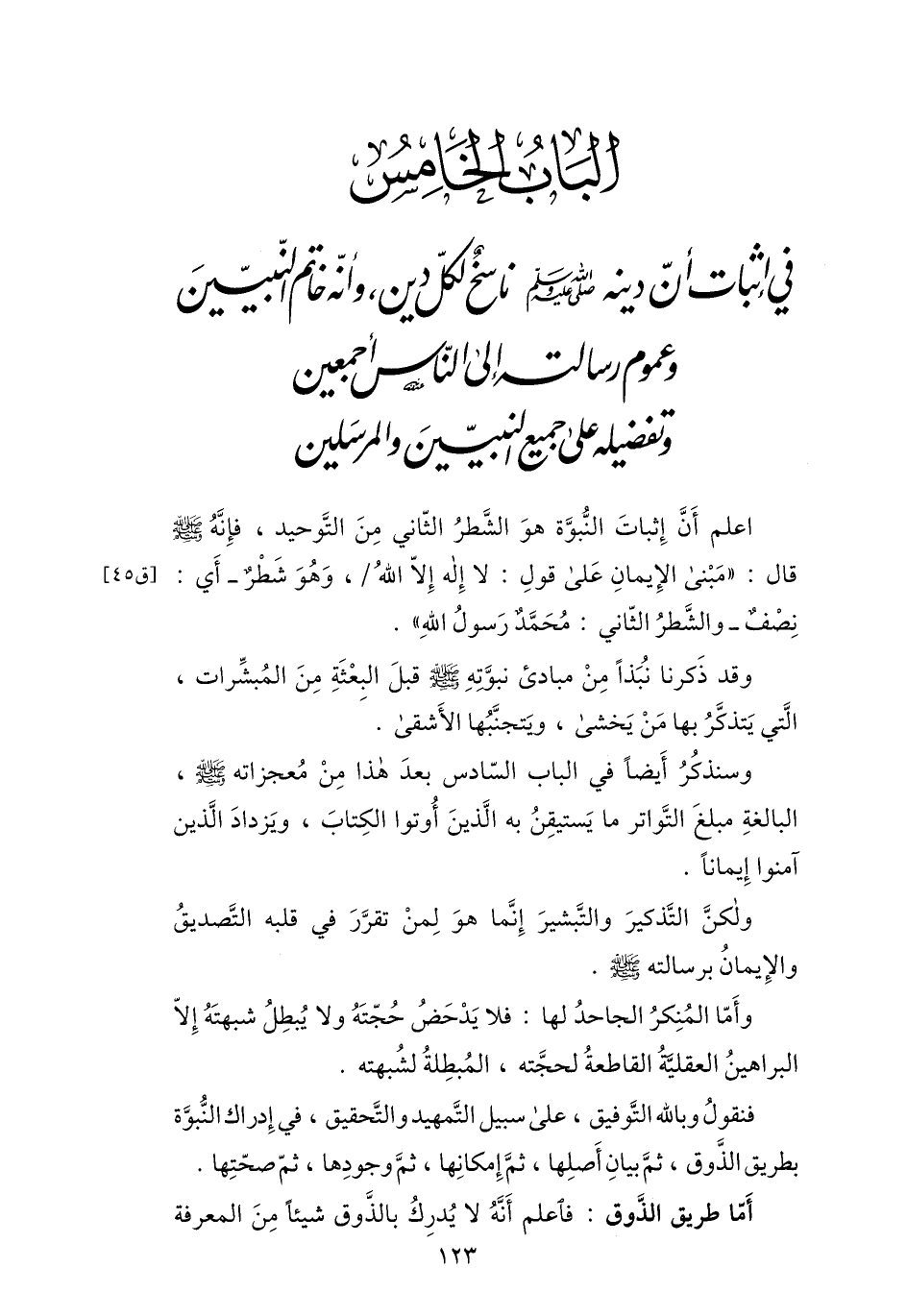 الباب الخامس في اثبات أنّ دينه صلى الله عليه وسلّم ناسخ لكلّ دين، وأنّه خاتم النّبيّين وعموم رسالته إلى النّاس أجمعين وتفضيله على جميع النبيّين والمرسلين