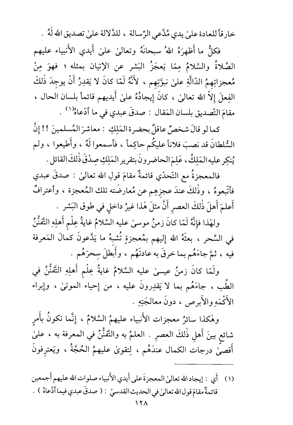 (1) أي: إيجاد الله تعالى المعجزة على أيدي الأنبياء صلوات الله عليهم أجمعين قائمة مقام قول الله تعالى في الحديث القدسيّ: (صدق عبدي فيما ادّعاه) .