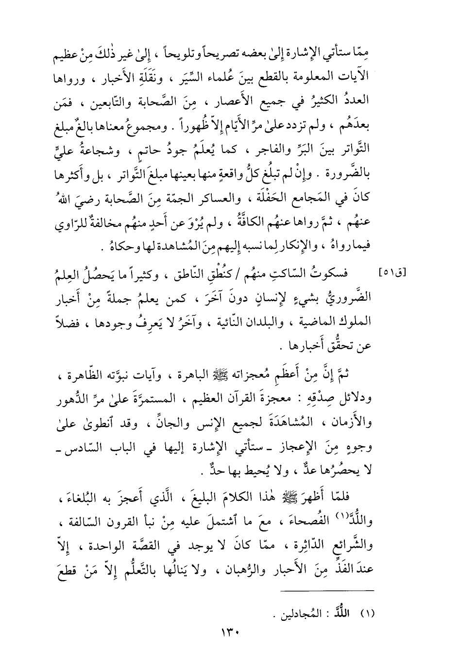 ممّا ستأتي الإشارة إلى بعضه تصريحا وتلويحا، إلى غير ذلك من عظيم الآيات المعلومة بالقطع بين علماء السّير، ونقلة الأخبار، ورواها العدد الكثير في جميع الأعصار، من الصّحابة والتّابعين، فمن بعدهم، ولم تزدد على مرّ الأيّام إلّا ظهورا. ومجموع معناها بالغ مبلغ التّواتر بين البرّ والفاجر، كما يعلم جود حاتم، وشجاعة عليّ بالضّرورة. وإن لم تبلغ كلّ واقعة منها بعينها مبلغ التّواتر، بل وأكثرها كان في المجامع الحفلة، والعساكر الجمّة من الصّحابة رضي الله عنهم، ثمّ رواها عنهم الكافّة، ولم يرو عن أحد منهم مخالفة للرّاوي فيما رواه، والإنكار لما نسبه إليهم من المشاهدة لها وحكاه.