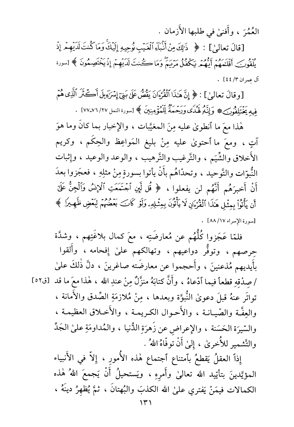 فلمّا عجزوا كلّهم عن معارضته، مع كمال بلاغتهم، وشدّة حرصهم، وتوفّر دواعيهم، وتهالكهم على إفحامه، وألقوا بأيديهم مذعنين، وأحجموا عن معارضته صاغرين، دلّ ذلك على/ صدقه قطعا فيما ادّعاه، وأنّ كتابه منزّل من عند الله، هذا مع ما قد تواتر عنه قبل دعوى النّبوّة وبعدها، من ملازمة الصّدق والأمانة، والعفّة والصّيانة، والأحوال الكريمة، والأخلاق العظيمة، والسّيرة الحسنة، والإعراض عن زهرة الدّنيا، والمداومة على الجدّ والتّشمير للآخرى، إلى أن توفّاه الله.