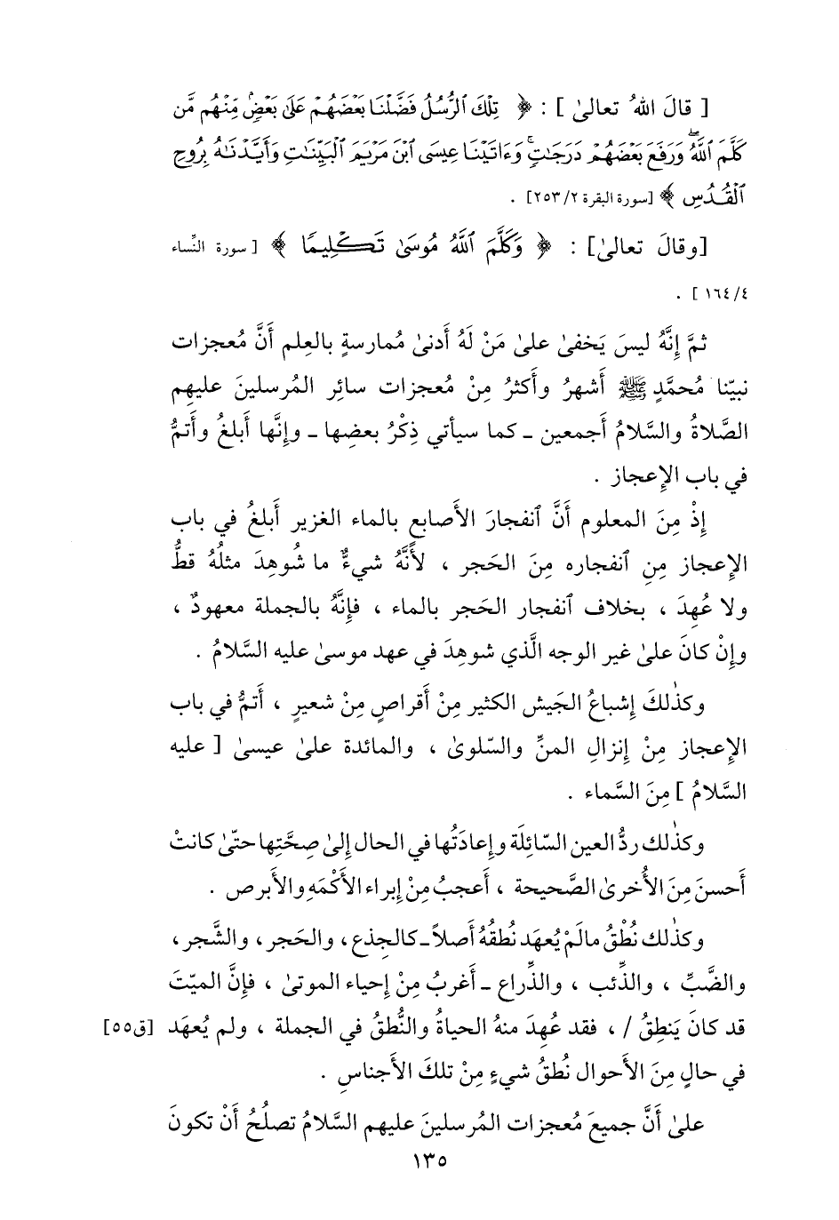 ثمّ إنّه ليس يخفى على من له أدنى ممارسة بالعلم أنّ معجزات نبيّنا محمّد صلى الله عليه وسلم أشهر وأكثر من معجزات سائر المرسلين عليهم الصّلاة والسّلام أجمعين- كما سيأتي ذكر بعضها- وإنّها أبلغ وأتمّ في باب الإعجاز.