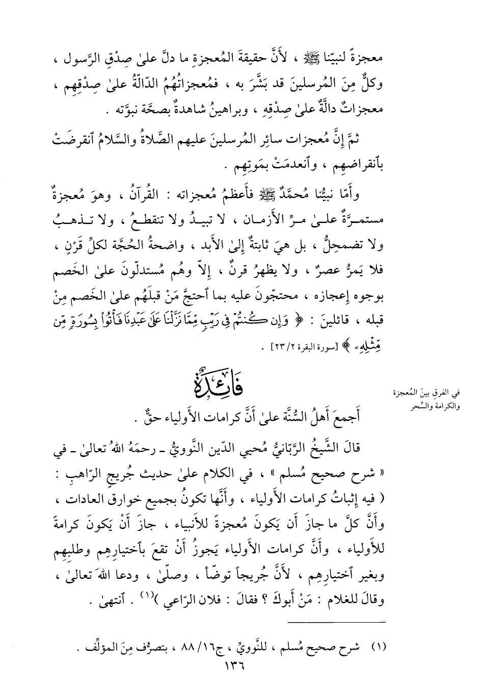 (فيه إثبات كرامات الأولياء، وأنّها تكون بجميع خوارق العادات، وأنّ كلّ ما جاز أن يكون معجزة للأنبياء، جاز أن يكون كرامة للأولياء، وأنّ كرامات الأولياء يجوز أن تقع باختيارهم وطلبهم وبغير اختيارهم، لأنّ جريجا توضّأ، وصلّى، ودعا الله تعالى، وقال للغلام: من أبوك؟ فقال: فلان الرّاعي) «1» . انتهى.
