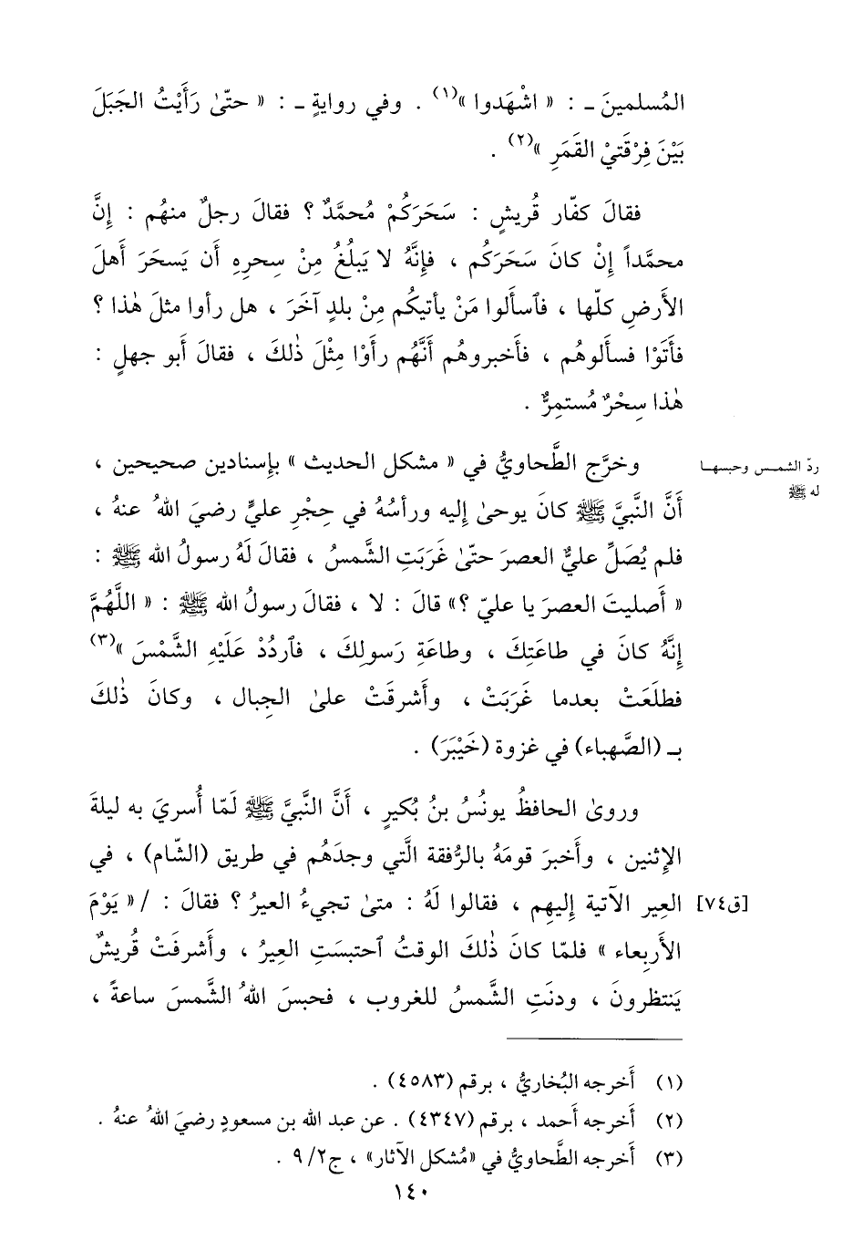 «أصليت العصر يا عليّ؟» قال: لا، فقال رسول الله صلى الله عليه وسلم: «اللهمّ إنّه كان في طاعتك، وطاعة رسولك، فاردد عليه الشّمس» «3» فطلعت بعدما غربت، وأشرقت على الجبال، وكان ذلك ب (الصّهباء) في غزوة (خيبر) .