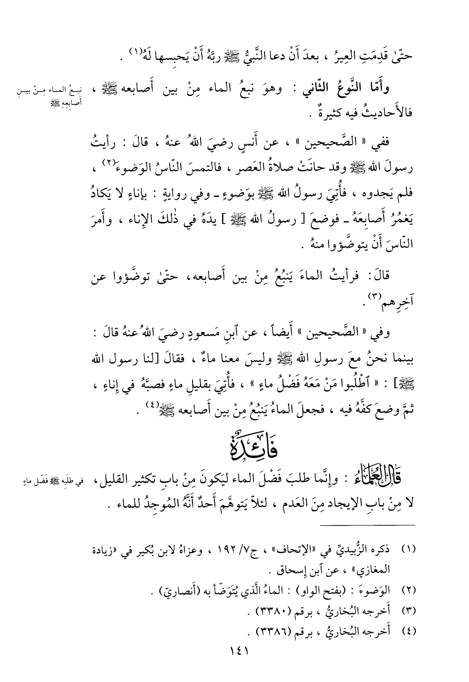 بينما نحن مع رسول الله صلى الله عليه وسلم وليس معنا ماء، فقال [لنا رسول الله صلى الله عليه وسلم] : «اطلبوا من معه فضل ماء» ، فأتي بقليل ماء فصبّه في إناء، ثمّ وضع كفّه فيه، فجعل الماء ينبع من بين أصابعه صلى الله عليه وسلم «4» .
