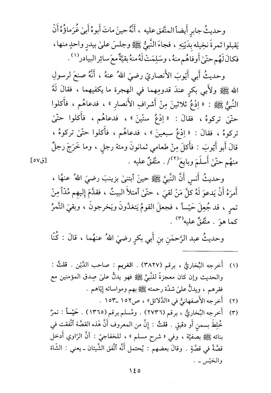 (1) أخرجه البخاريّ، برقم (3827) . الغريم: صاحب الدّين. قلت: والحديث وإن كان معجزة للنّبيّ صلى الله عليه وسلم فهو يدلّ على صدق المؤمنين مع فقرهم، ويدلّ على شدّة رحمته صلى الله عليه وسلم بهم ومواساته إيّاهم.