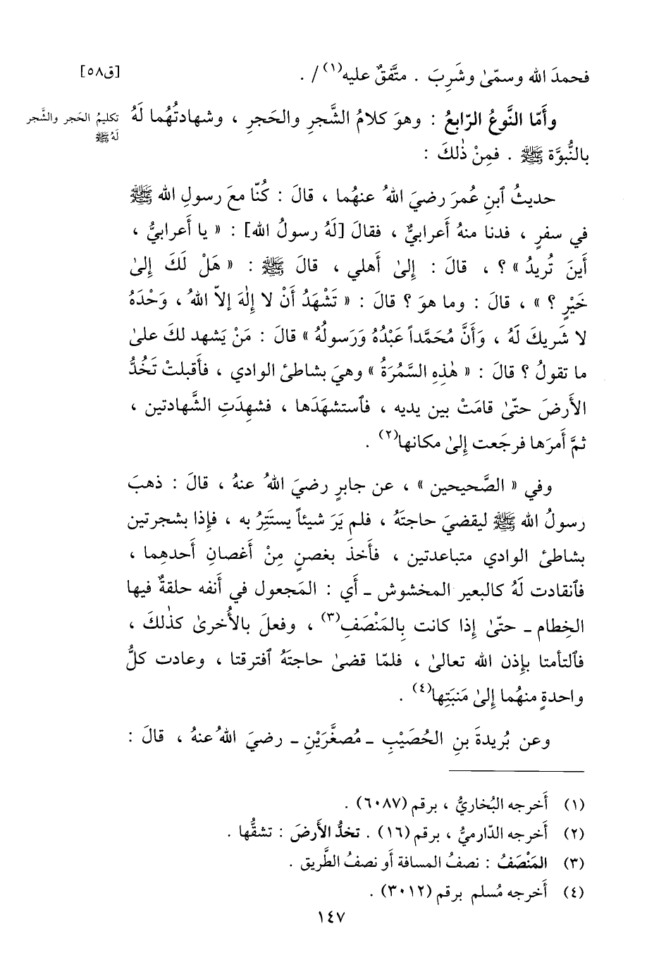 حديث ابن عمر رضي الله عنهما، قال: كنّا مع رسول الله صلى الله عليه وسلم في سفر، فدنا منه أعرابيّ، فقال [له رسول الله] : «يا أعرابيّ، أين تريد» ؟، قال: إلى أهلي، قال صلى الله عليه وسلم: «هل لك إلى خير؟» ، قال: وما هو؟ قال: «تشهد أن لا إله إلّا الله، وحده لا شريك له، وأنّ محمّدا عبده ورسوله» قال: من يشهد لك على ما تقول؟ قال: «هذه السّمرة» وهي بشاطئ الوادي، فأقبلت تخدّ الأرض حتّى قامت بين يديه، فاستشهدها، فشهدت الشّهادتين، ثمّ أمرها فرجعت إلى مكانها «2» .