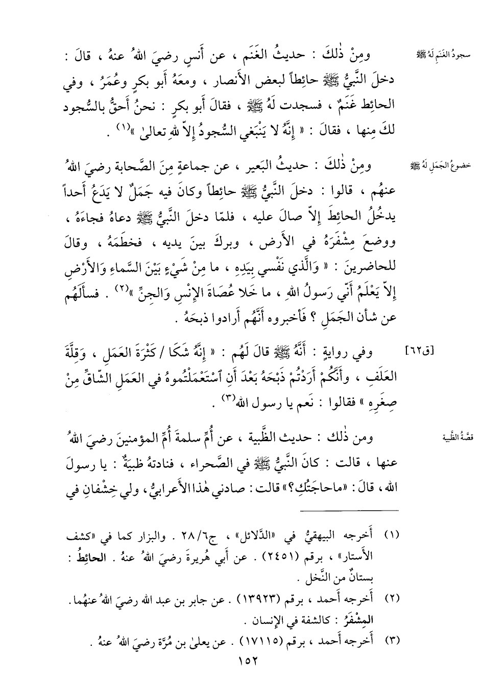 ومن ذلك: حديث البعير، عن جماعة من الصّحابة رضي الله عنهم، قالوا: دخل النّبيّ صلى الله عليه وسلم حائطا وكان فيه جمل لا يدع أحدا يدخل الحائط إلّا صال عليه، فلمّا دخل النّبيّ صلى الله عليه وسلم دعاه فجاءه، ووضع مشفره في الأرض، وبرك بين يديه، فخطمه، وقال للحاضرين: «والّذي نفسي بيده، ما من شيء بين السّماء والأرض إلّا يعلم أنّي رسول الله، ما خلا عصاة الإنس والجنّ» «2» . فسألهم عن شأن الجمل؟ فأخبروه أنّهم أرادوا ذبحه.