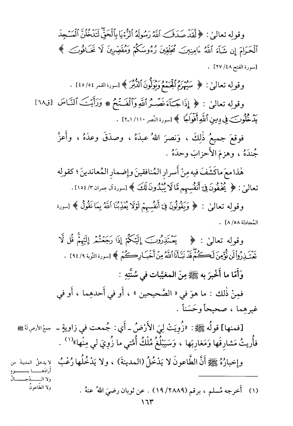 وإخباره صلى الله عليه وسلم أنّ الطّاعون لا يدخل (المدينة) ، ولا يدخلها رعب
