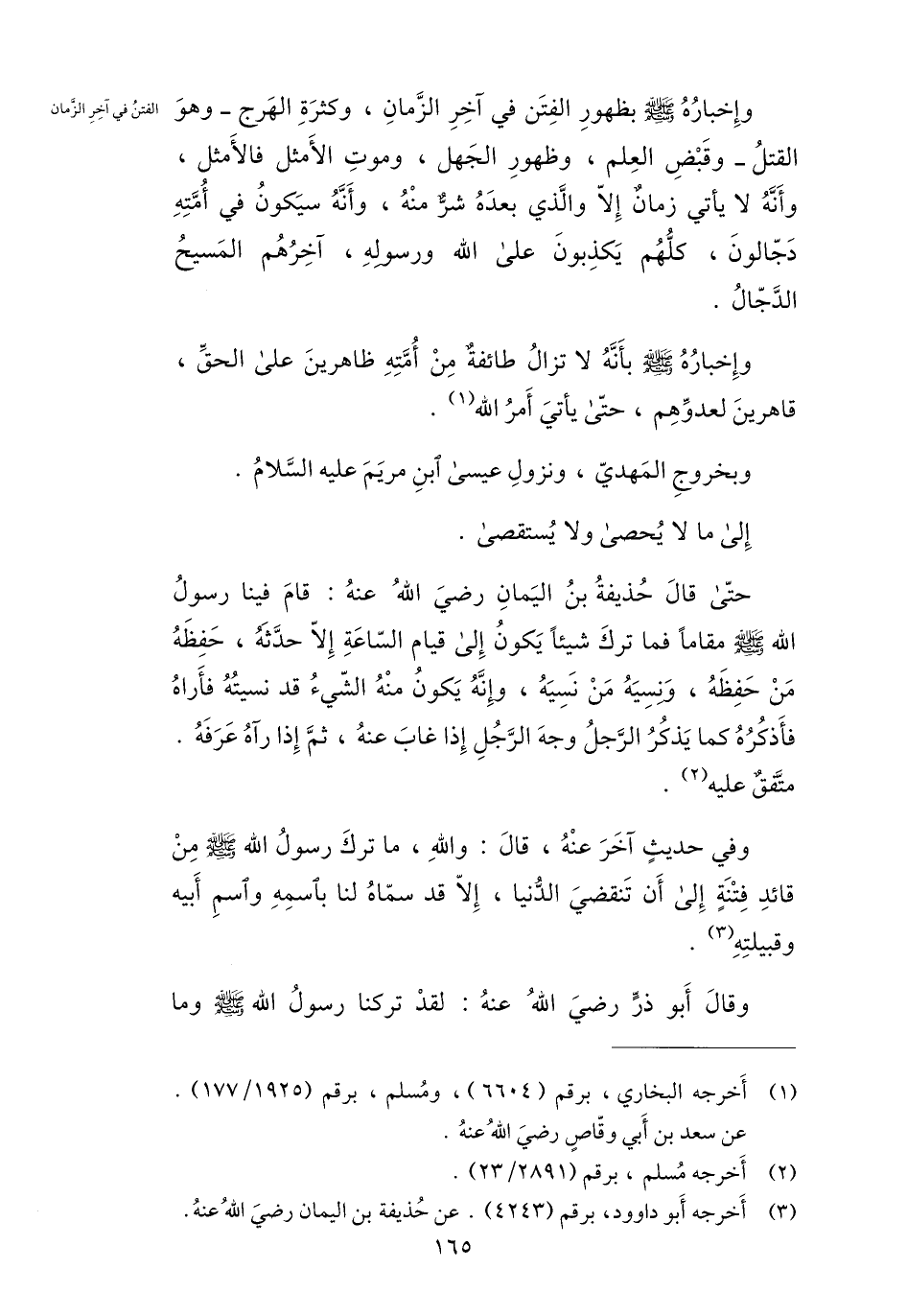 وإخباره صلى الله عليه وسلم بظهور الفتن في آخر الزّمان، وكثرة الهرج- وهو القتل- وقبض العلم، وظهور الجهل، وموت الأمثال فالأمثل، وأنّه لا يأتي زمان إلّا والّذي بعده شرّ منه، وأنّه سيكون في أمّته دجّالون، كلّهم يكذبون على الله ورسوله، آخرهم المسيح الدّجّال.