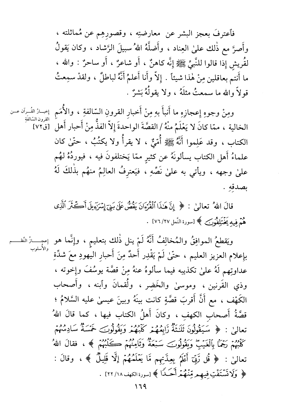 ومن وجوه إعجازه ما أنبأ به من أخبار القرون السّالفة، والأمم الخالية، ممّا كان لا يعلم منه/ القصّة الواحدة إلّا الفذّ من أحبار أهل الكتاب، وقد علموا أنّه صلى الله عليه وسلم أمّيّ، لا يقرأ ولا يكتب، حتّى كان علماء أهل الكتاب يسألونه عن كثير ممّا يختلفون فيه، فيورده لهم على وجهه، ويأتي به على نصّه، فيعترف العالم منهم بذلك له بصدقه.