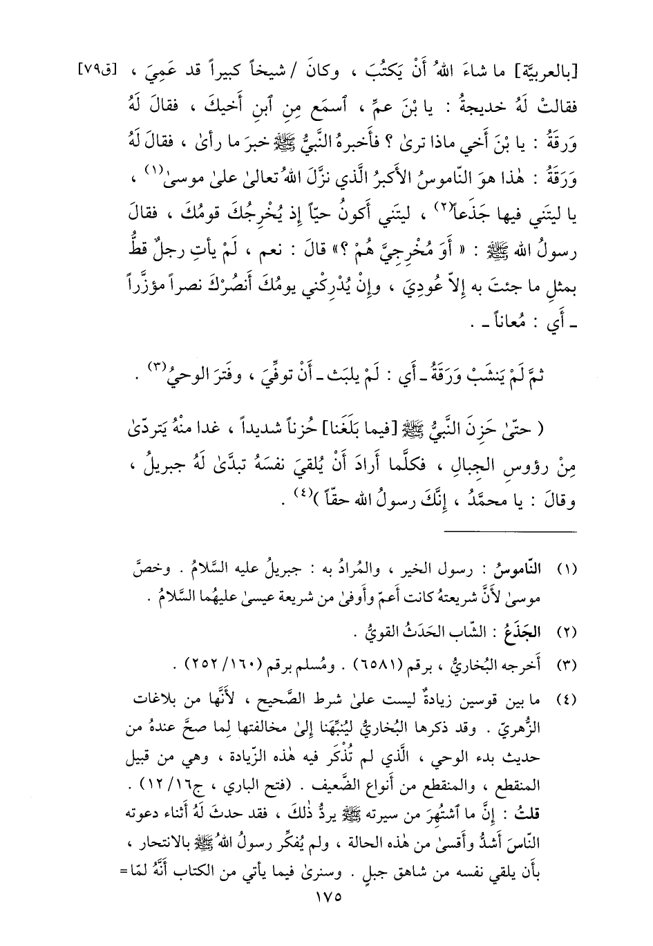 (4) ما بين قوسين زيادة ليست على شرط الصّحيح، لأنّها من بلاغات الزّهريّ. وقد ذكرها البخاريّ لينبّهنا إلى مخالفتها لما صحّ عنده من حديث بدء الوحي، الّذي لم تذكر فيه هذه الزّيادة، وهي من قبيل المنقطع، والمنقطع من أنواع الضّعيف. (فتح الباري، ج 16/ 12) . قلت: إنّ ما اشتهر من سيرته صلى الله عليه وسلم يردّ ذلك، فقد حدث له أثناء دعوته النّاس أشدّ وأقسى من هذه الحالة، ولم يفكّر رسول الله صلى الله عليه وسلم بالانتحار، بأن يلقي نفسه من شاهق جبل. وسنرى فيما يأتي من الكتاب أنّه لمّا