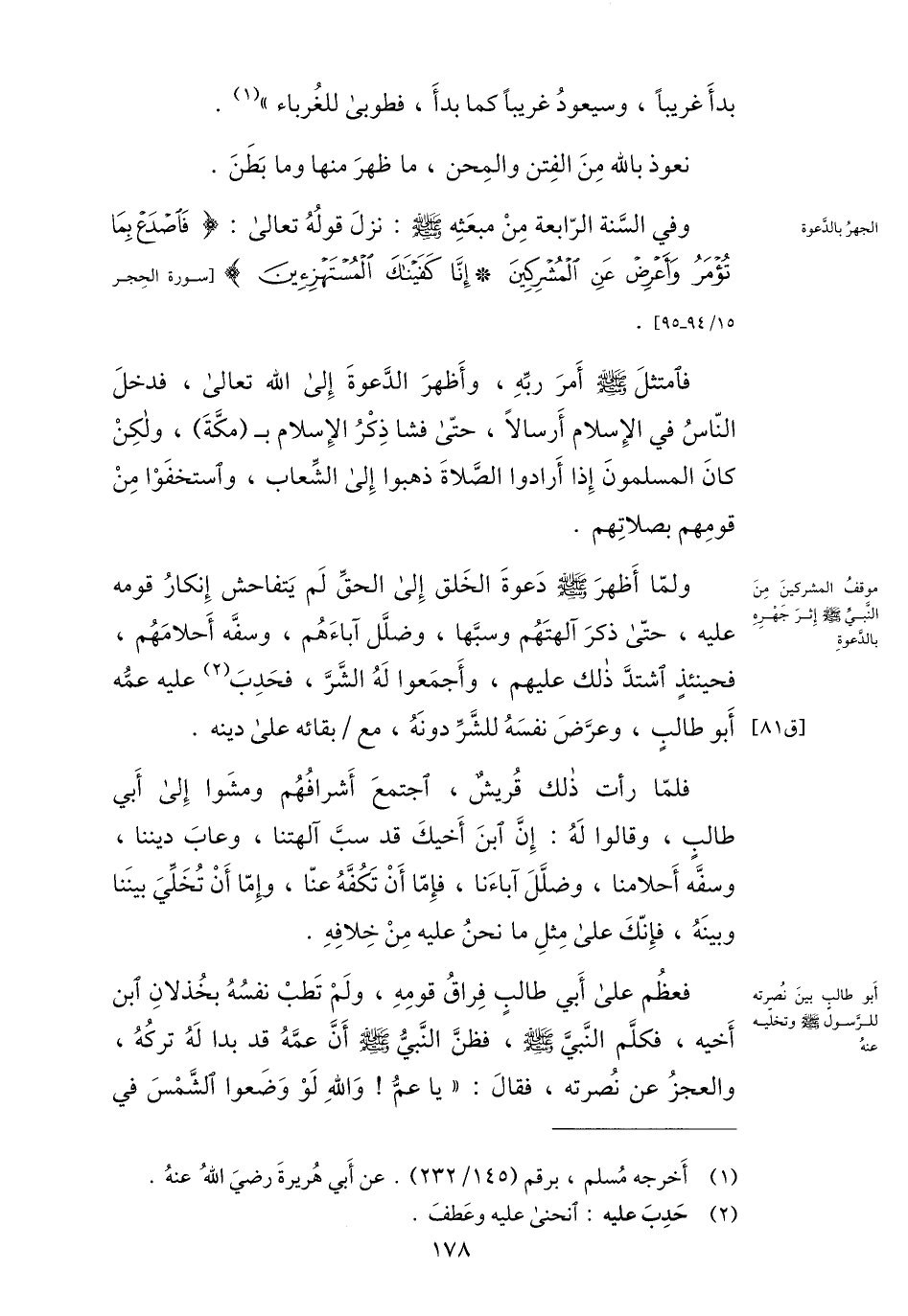 ولمّا أظهر صلى الله عليه وسلم دعوة الخلق إلى الحقّ لم يتفاحش إنكار قومه عليه، حتّى ذكر آلهتهم وسبّها، وضلّل آباءهم، وسفّه أحلامهم، فحينئذ اشتدّ ذلك عليهم، وأجمعوا له الشّرّ، فحدب «2» عليه عمّه أبو طالب، وعرّض نفسه للشّرّ دونه، مع/ بقائه على دينه.