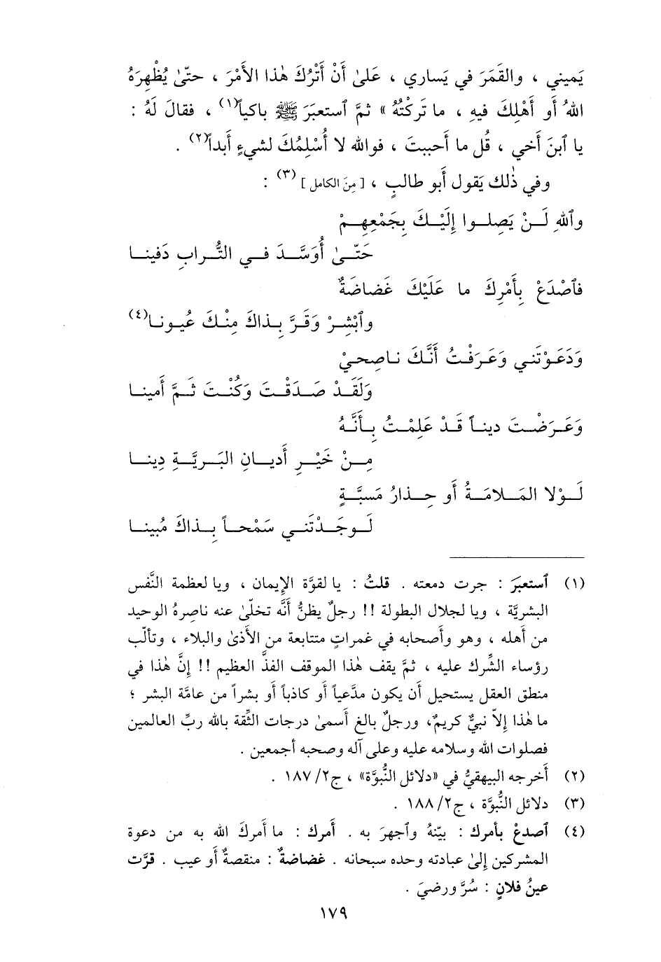 (1) استعبر: جرت دمعته. قلت: يا لقوّة الإيمان، ويا لعظمة النّفس البشريّة، ويا لجلال البطولة!! رجل يظنّ أنّه تخلّى عنه ناصره الوحيد من أهله، وهو وأصحابه في غمرات متتابعة من الأذى والبلاء، وتألّب رؤساء الشّرك عليه، ثمّ يقف هذا الموقف الفذّ العظيم!! إنّ هذا في منطق العقل يستحيل أن يكون مدّعيا أو كاذبا أو بشرا من عامّة البشر؛ ما هذا إلّا نبيّ كريم، ورجل بالغ أسمى درجات الثّقة بالله ربّ العالمين. فصلوات الله وسلامه عليه وعلى آله وصحبه أجمعين.