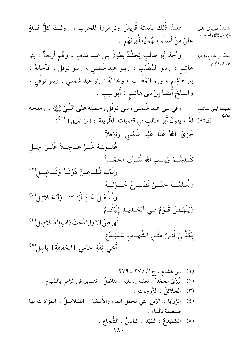 وفي بني عبد شمس وبني نوفل وحميّته على النّبيّ صلى الله عليه وسلم، ومدحه له، يقول أبو طالب في قصيدته الطّويلة، [من الطّويل] / «1» :