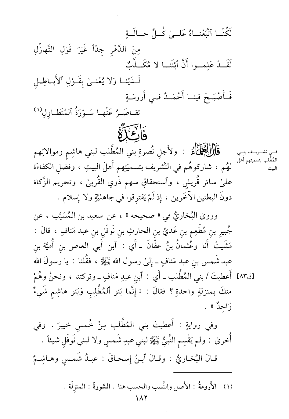 مشيت أنا وعثمان بن عفّان- أي: ابن أبي العاص بن أميّة بن عبد شمس بن عبد مناف- إلى رسول الله صلى الله عليه وسلم، فقلنا: يا رسول الله أعطيت/ بني المطّلب- أي: ابن عبد مناف- وتركتنا، ونحن وهم منك بمنزلة واحدة؟ فقال: «إنّما بنو المطّلب وبنو هاشم شيء واحد» .