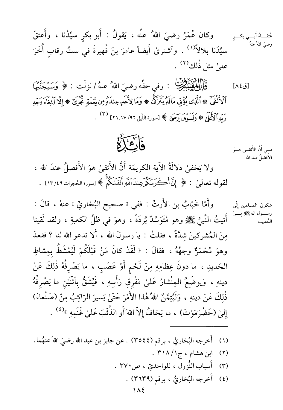 وكان عمر رضي الله عنه، يقول: أبو بكر سيّدنا، وأعتق سيّدنا بلالا «1» . واشترى أيضا عامر بن فهيرة في ستّ رقاب أخر على مثل ذلك «2» .