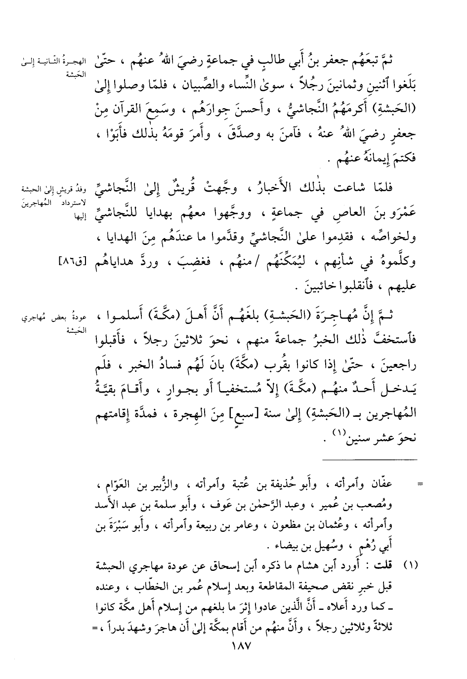 (1) قلت: أورد ابن هشام ما ذكره ابن إسحاق عن عودة مهاجري الحبشة قبل خبر نقض صحيفة المقاطعة وبعد إسلام عمر بن الخطّاب، وعنده- كما ورد أعلاه- أنّ الّذين عادوا إثر ما بلغهم من إسلام أهل مكّة كانوا ثلاثة وثلاثين رجلا، وأنّ منهم من أقام بمكّة إلى أن هاجر وشهد بدرا،