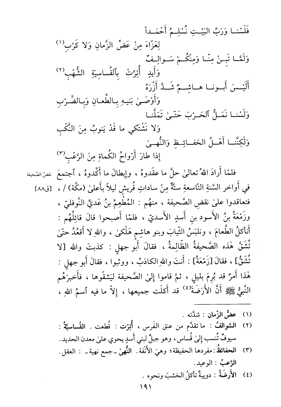 أنأكل الطّعام، ونلبس الثّياب وبنو هاشم هلكى، والله لا أقعد حتّى تشقّ هذه الصّحيفة الظّالمة، فقال أبو جهل: كذبت والله [لا تشقّ] ، فقال [زمعة] : أنت والله الكاذب، ووثبوا، فقال أبو جهل: