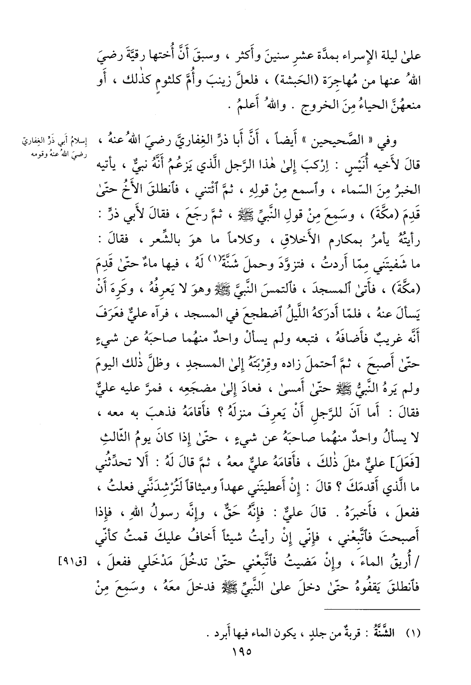 ما شفيتني ممّا أردت، فتزوّد وحمل شنّة «1» له، فيها ماء حتّى قدم (مكّة) ، فأتى المسجد، فالتمس النّبيّ صلى الله عليه وسلم وهو لا يعرفه، وكره أن يسأل عنه، فلمّا أدركه اللّيل اضطجع في المسجد، فرآه عليّ فعرف أنّه غريب فأضافه، فتبعه ولم يسأل واحد منهما صاحبه عن شيء حتّى أصبح، ثمّ احتمل زاده وقربته إلى المسجد، وظلّ ذلك اليوم ولم يره النّبيّ صلى الله عليه وسلم حتّى أمسى، فعاد إلى مضجعه، فمرّ عليه عليّ فقال: أما آن للرّجل أن يعرف منزله؟ فأقامه فذهب به معه، لا يسأل واحد منهما صاحبه عن شيء، حتّى إذا كان يوم الثّالث [فعل] عليّ مثل ذلك، فأقامه عليّ معه، ثمّ قال له: ألا تحدّثني ما الّذي أقدمك؟ قال: إن أعطيتني عهدا وميثاقا لترشدنّني فعلت، ففعل، فأخبره. قال عليّ: فإنّه حقّ، وإنّه رسول الله، فإذا أصبحت فاتّبعني، فإنّي إن رأيت شيئا أخاف عليك قمت كأنّي/ أريق الماء، وإن مضيت فاتّبعني حتّى تدخل مدخلي ففعل، فانطلق يقفوه حتّى دخل على النّبيّ صلى الله عليه وسلم فدخل معه، وسمع من
