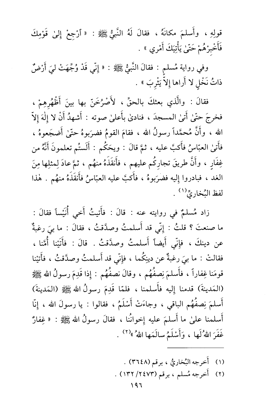 ما صنعت؟ قلت: إنّي قد أسلمت وصدّقت، فقال: ما بي رغبة عن دينك، فإنّي أيضا أسلمت وصدّقت. قال: فأتينا أمّنا، فقالت: ما بي رغبة عن دينكما، فإنّي قد أسلمت وصدّقت، فأتينا قومنا غفارا، فأسلم نصفهم، وقال نصفهم: إذا قدم رسول الله صلى الله عليه وسلم (المدينة) قدمنا إليه فأسلمنا، فلمّا قدم رسول الله صلى الله عليه وسلم (المدينة) أسلم نصفهم الباقي، وجاءت أسلم، فقالوا: يا رسول الله، إنّا أسلمنا على ما أسلم عليه إخواننا، فقال رسول الله صلى الله عليه وسلم: «غفار غفر الله لها، وأسلم سالمها الله» «2» .