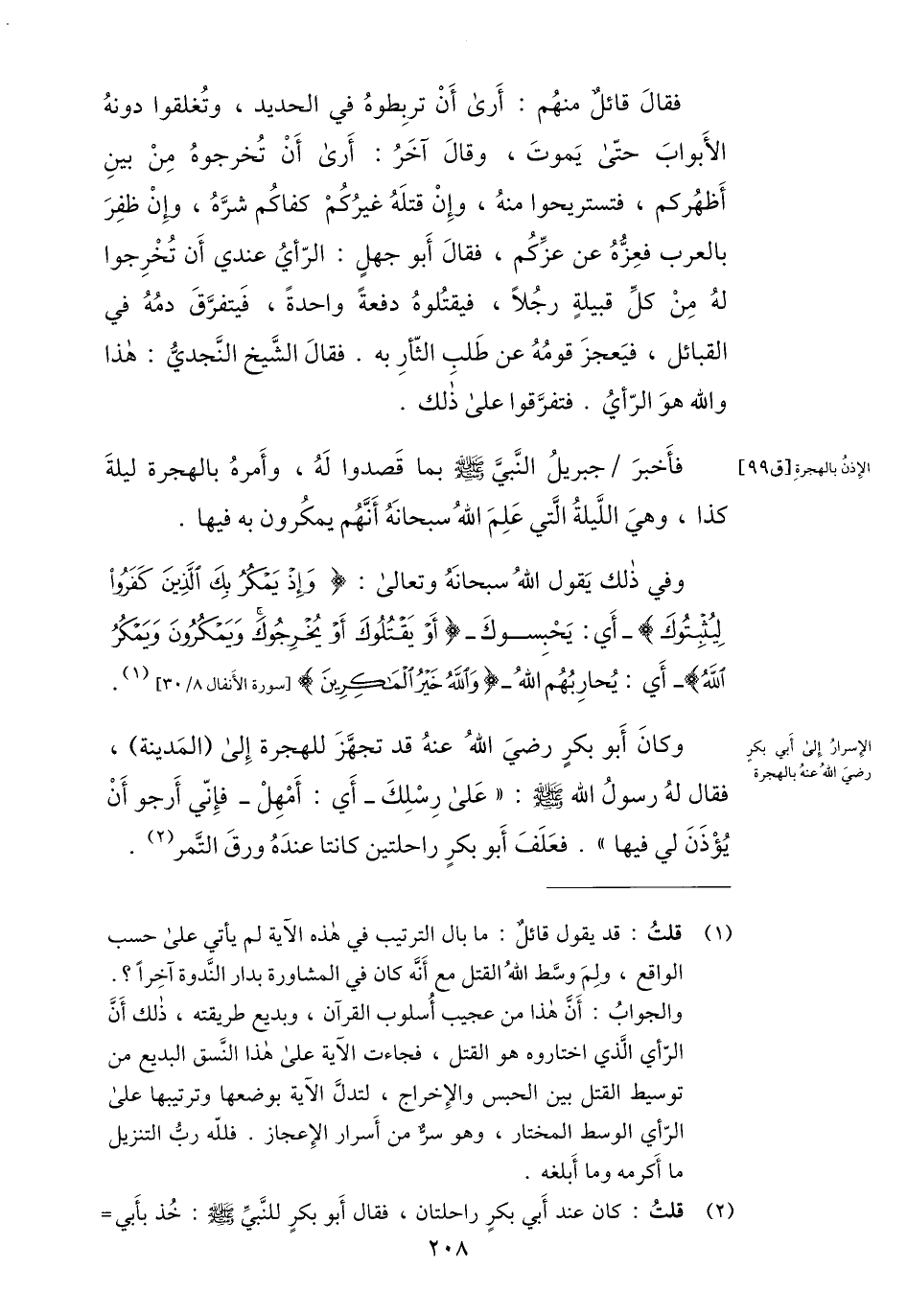 (1) قلت: قد يقول قائل: ما بال الترتيب في هذه الآية لم يأتي على حسب الواقع، ولم وسّط الله القتل مع أنّه كان في المشاورة بدار النّدوة آخرا؟. والجواب: أنّ هذا من عجيب أسلوب القرآن، وبديع طريقته، ذلك أنّ الرّأي الّذي اختاروه هو القتل، فجاءت الآية على هذا النّسق البديع من توسيط القتل بين الحبس والإخراج، لتدلّ الآية بوضعها وترتيبها على الرّأي الوسط المختار، وهو سرّ من أسرار الإعجاز. فلله ربّ التنزيل ما أكرمه وما أبلغه.
