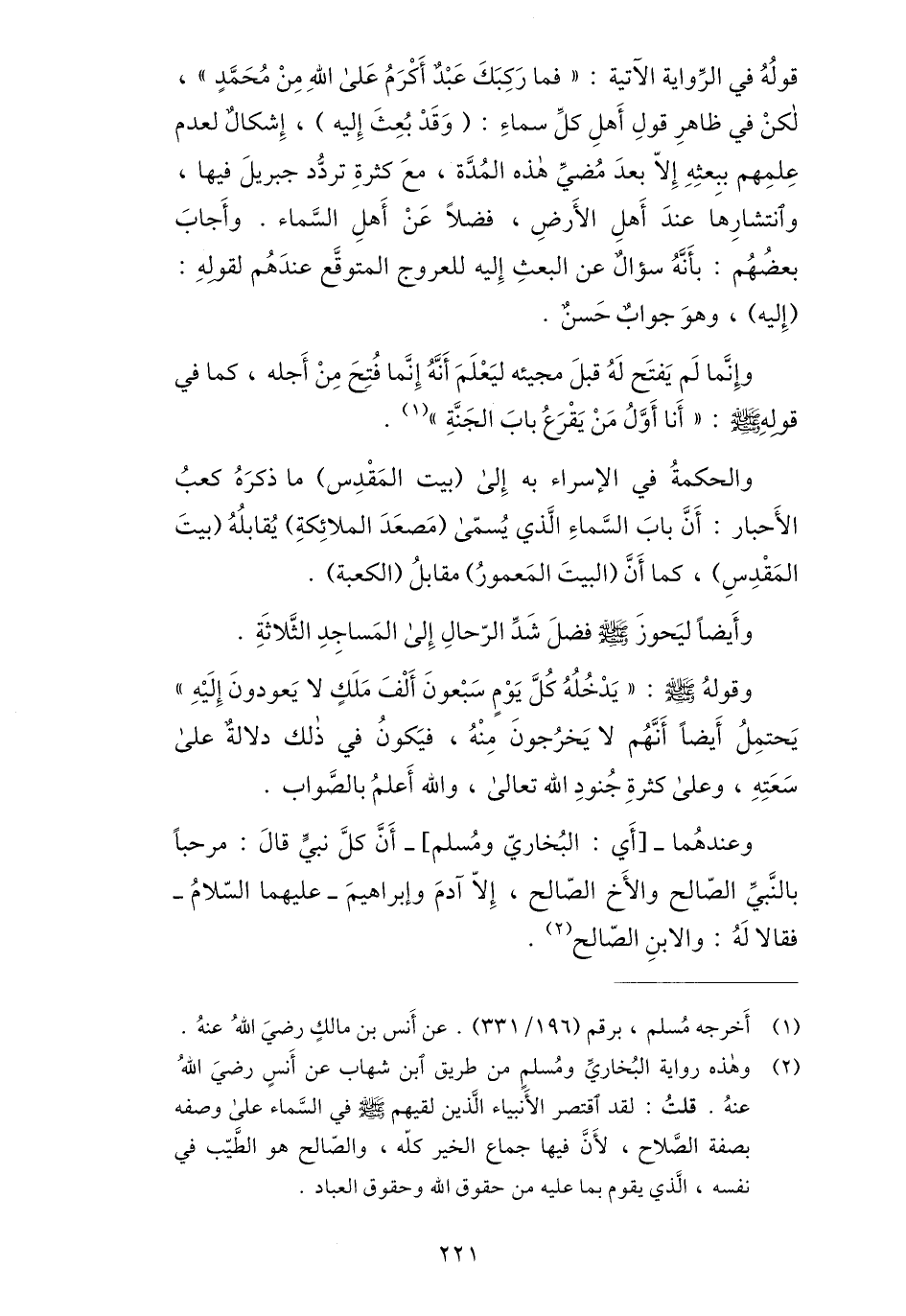 (2) وهذه رواية البخاريّ ومسلم من طريق ابن شهاب عن أنس رضي الله عنه. قلت: لقد اقتصر الأنبياء الّذين لقيهم صلى الله عليه وسلم في السّماء على وصفه بصفة الصّلاح، لأنّ فيها جماع الخير كلّه، والصّالح هو الطّيّب في نفسه، الّذي يقوم بما عليه من حقوق الله وحقوق العباد.