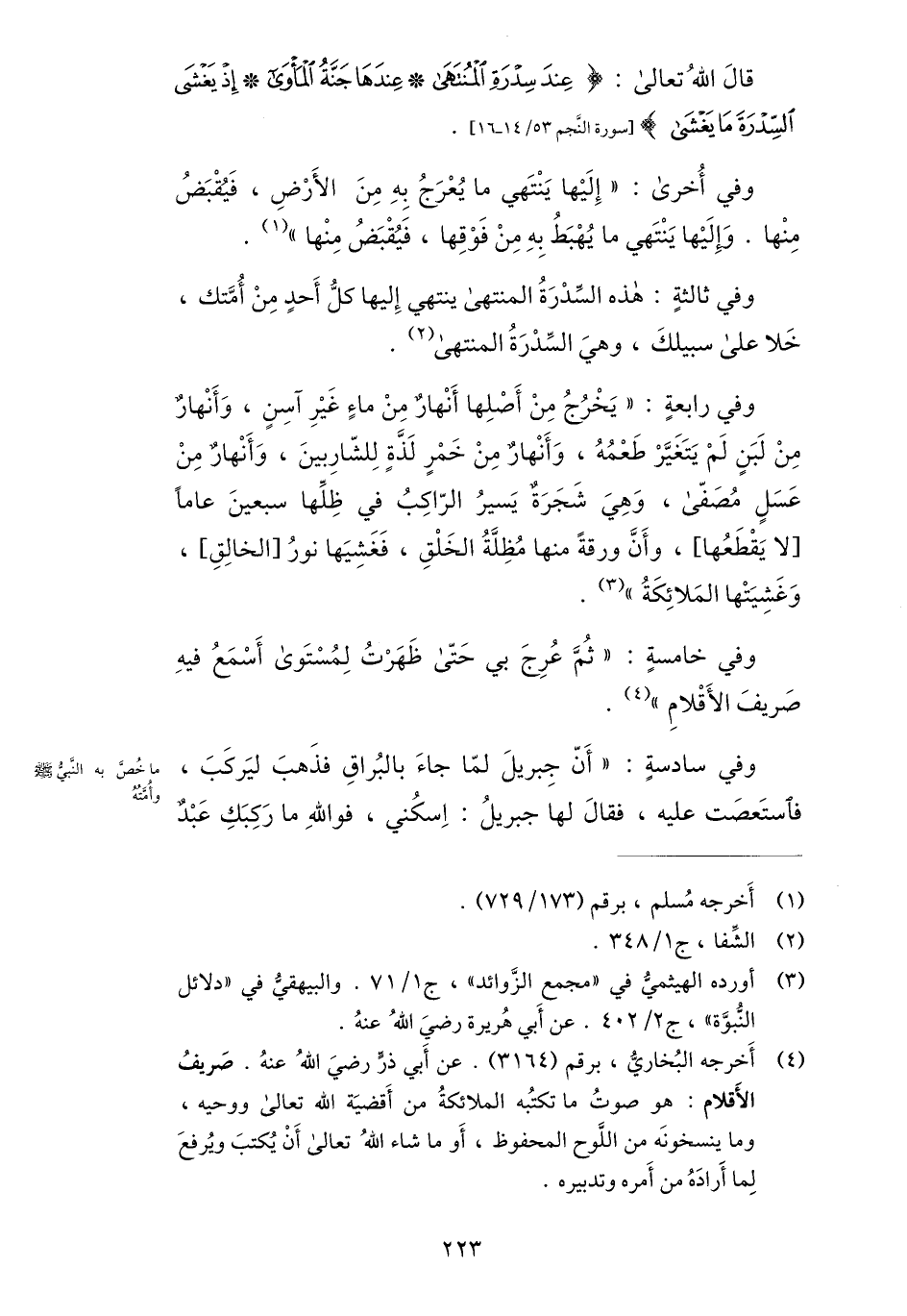 وفي أخرى: «إليها ينتهي ما يعرج به من الأرض، فيقبض منها. وإليها ينتهي ما يهبط به من فوقها، فيقبض منها» «1» .