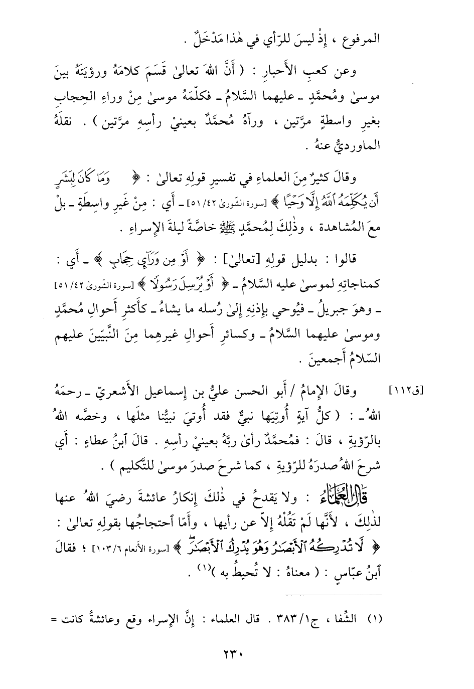 وعن كعب الأحبار: (أنّ الله تعالى قسم كلامه ورؤيته بين موسى ومحمّد- عليهما السّلام- فكلّمه موسى من وراء الحجاب بغير واسطة مرّتين، ورآه محمّد بعيني رأسه مرّتين) . نقله الماورديّ عنه.