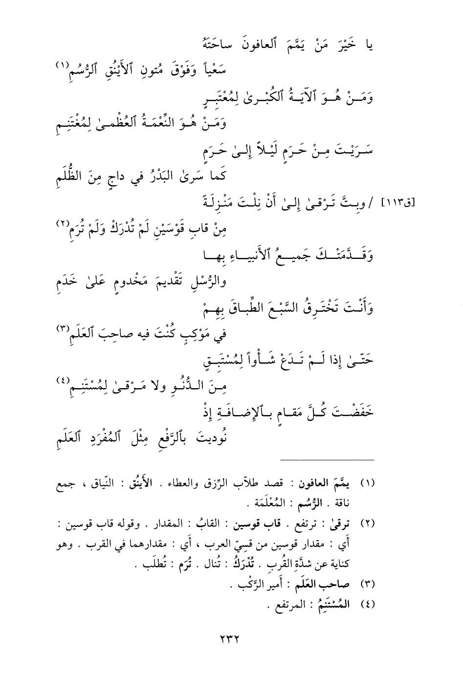 (2) ترقى: ترتفع. قاب قوسين: القاب: المقدار. وقوله قاب قوسين: أي: مقدار قوسين من قسيّ العرب، أي: مقدارهما في القرب. وهو كناية عن شدّة القرب. تدرك: تنال. ترم: تطلب.