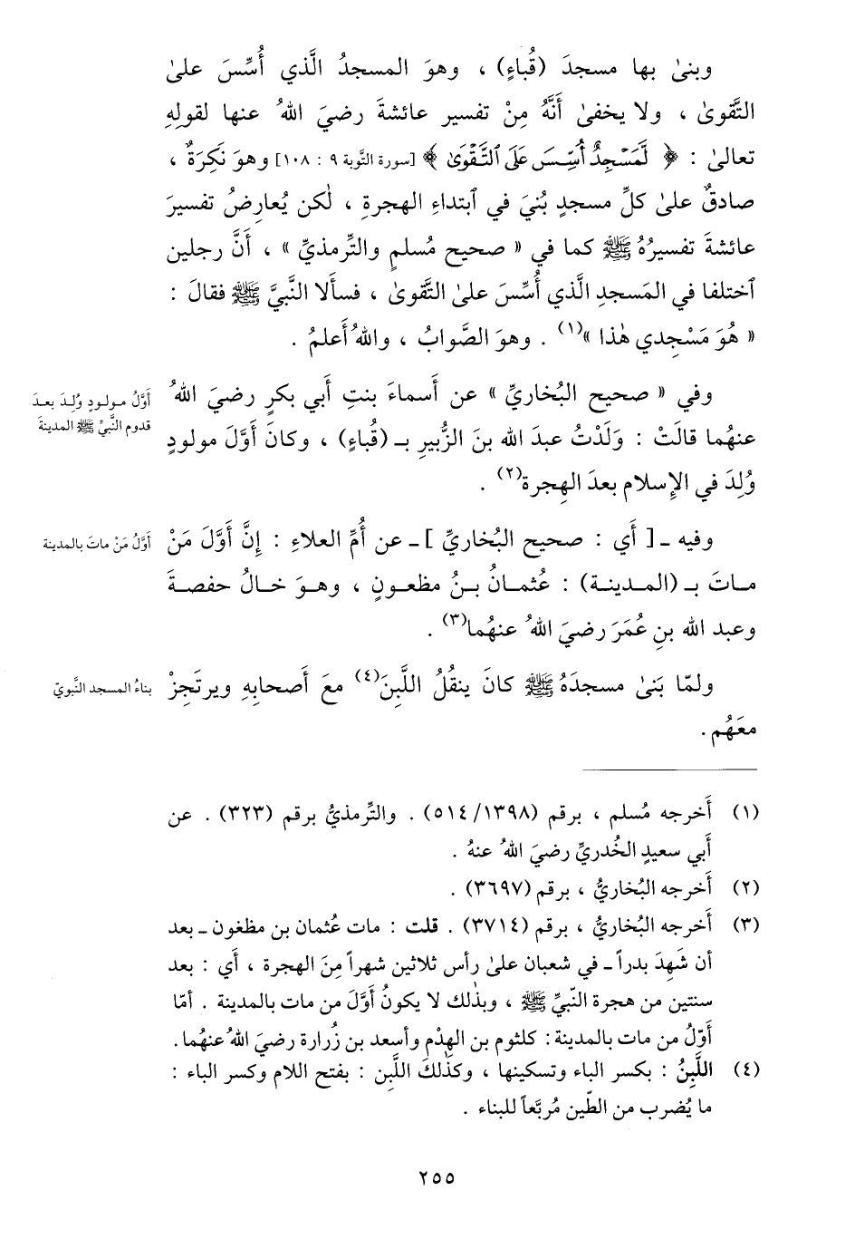 وبنى بها مسجد (قباء) ، وهو المسجد الّذي أسّس على التّقوى، ولا يخفى أنّه من تفسير عائشة رضي الله عنها لقوله تعالى: لَمَسْجِدٌ أُسِّسَ عَلَى التَّقْوى [سورة التّوبة 9: 108] وهو نكرة، صادق على كلّ مسجد بني في ابتداء الهجرة، لكن يعارض تفسير عائشة تفسيره صلى الله عليه وسلم كما في «صحيح مسلم والتّرمذيّ» ، أنّ رجلين اختلفا في المسجد الّذي أسّس على التّقوى، فسألا النّبيّ صلى الله عليه وسلم فقال: