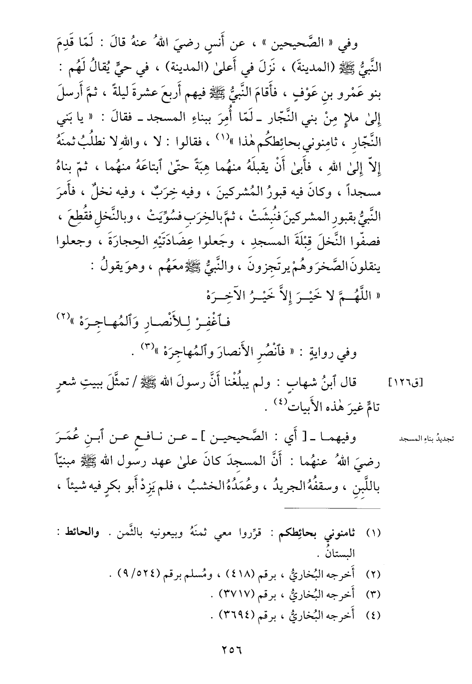 بنو عمرو بن عوف، فأقام النّبيّ صلى الله عليه وسلّم فيهم أربع عشرة ليلة، ثمّ أرسل إلى ملإ من بني النّجّار- لمّا أمر ببناء المسجد- فقال: «يا بني النّجّار، ثامنوني بحائطكم هذا» «1» ، فقالوا: لا، والله لا نطلب ثمنه إلّا إلى الله، فأبى أن يقبله منهما هبة حتّى ابتاعه منهما، ثمّ بناه مسجدا، وكان فيه قبور المشركين، وفيه خرب، وفيه نخل، فأمر النّبيّ بقبور المشركين فنبشت، ثمّ بالخرب فسوّيت، وبالنّخل فقطع، فصفّوا النّخل قبلة المسجد، وجعلوا عضادتيه الحجارة، وجعلوا ينقلون الصّخروهم يرتجزون، والنّبيّ صلى الله عليه وسلّم معهم، وهو يقول: