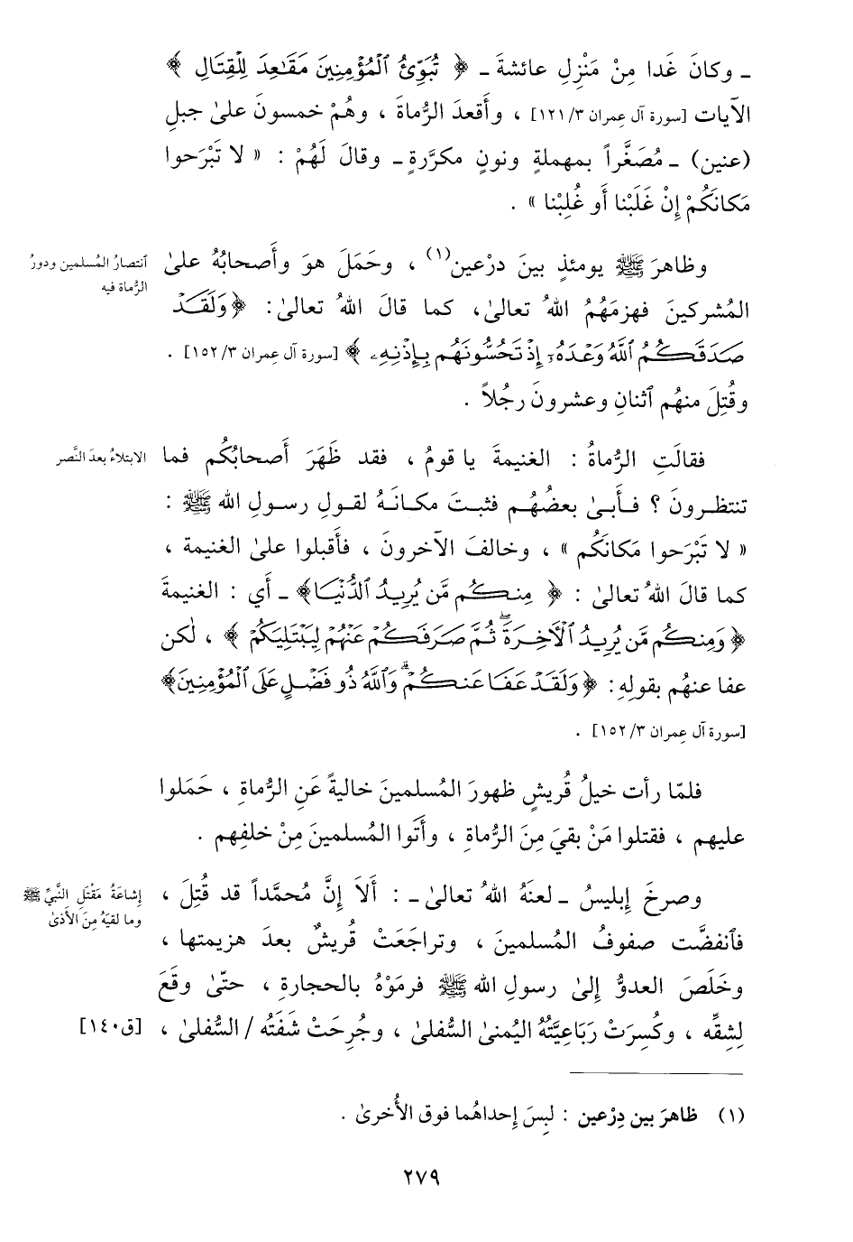 - وكان غدا من منزل عائشة- تُبَوِّئُ الْمُؤْمِنِينَ مَقاعِدَ لِلْقِتالِ الآيات [سورة آل عمران 3/ 121] ، وأقعد الرّماة، وهم خمسون على جبل (عنين) - مصغّرا بمهملة ونون مكرّرة- وقال لهم: «لا تبرحوا مكانكم إن غلبنا أو غلبنا» .