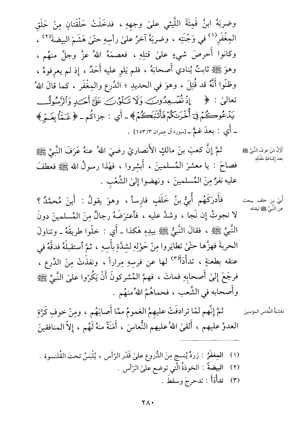 وضربه ابن قمئة اللّيثي على وجهه، فدخلت حلقتان من حلق المغفر «1» في وجنته، وضربه آخر على رأسه حتّى هشم البيضة «2» ، وكانوا أحرص شيء على قتله، فعصمه الله عزّ وجلّ منهم، وهو صلى الله عليه وسلم ثابت ينادي أصحابه، فلم يلو عليه أحد، إذ لم يعرفوه، وظنّوا أنّه قد قتل، وهو في الحديد؛ الدّرع والمغفر، كما قال الله تعالى: إِذْ تُصْعِدُونَ وَلا تَلْوُونَ عَلى أَحَدٍ وَالرَّسُولُ يَدْعُوكُمْ فِي أُخْراكُمْ فَأَثابَكُمْ- أي: جزاكم- غَمًّا بِغَمٍّ- أي: بعد غمّ-[سورة آل عمران 3/ 153] .